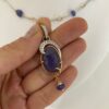 Anello con pietra in radice di zaffiro ovale sfaccettata, rilegata in oro rosa, contornata con diamanti taglio brillante 0.20, gr. 5.30. Pezzo unico. Abbinabile a girocollo con tanzanite con pendente. Mis. 14.