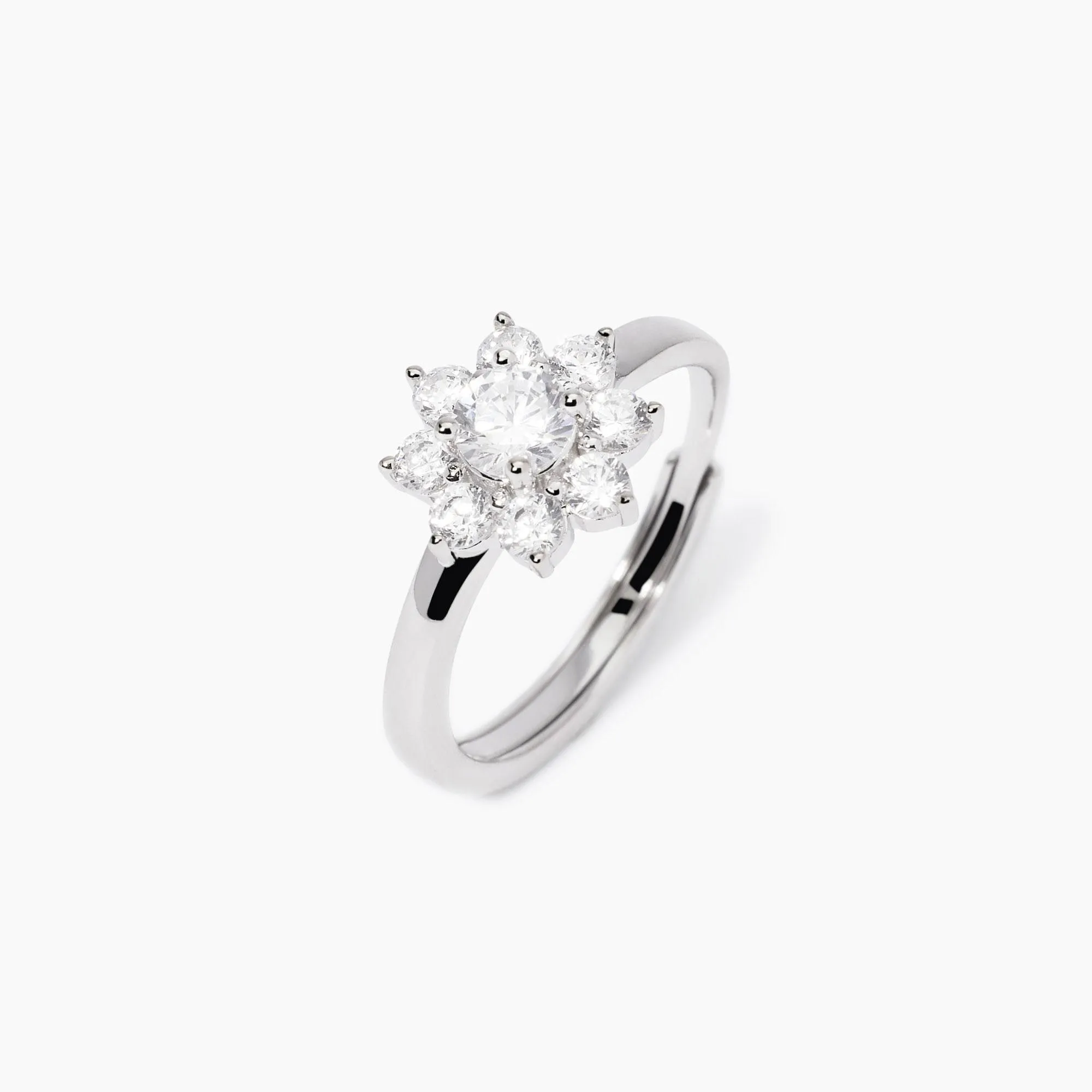 Anello regolabile da donna in argento rodiato con zirconi taglio girasole.