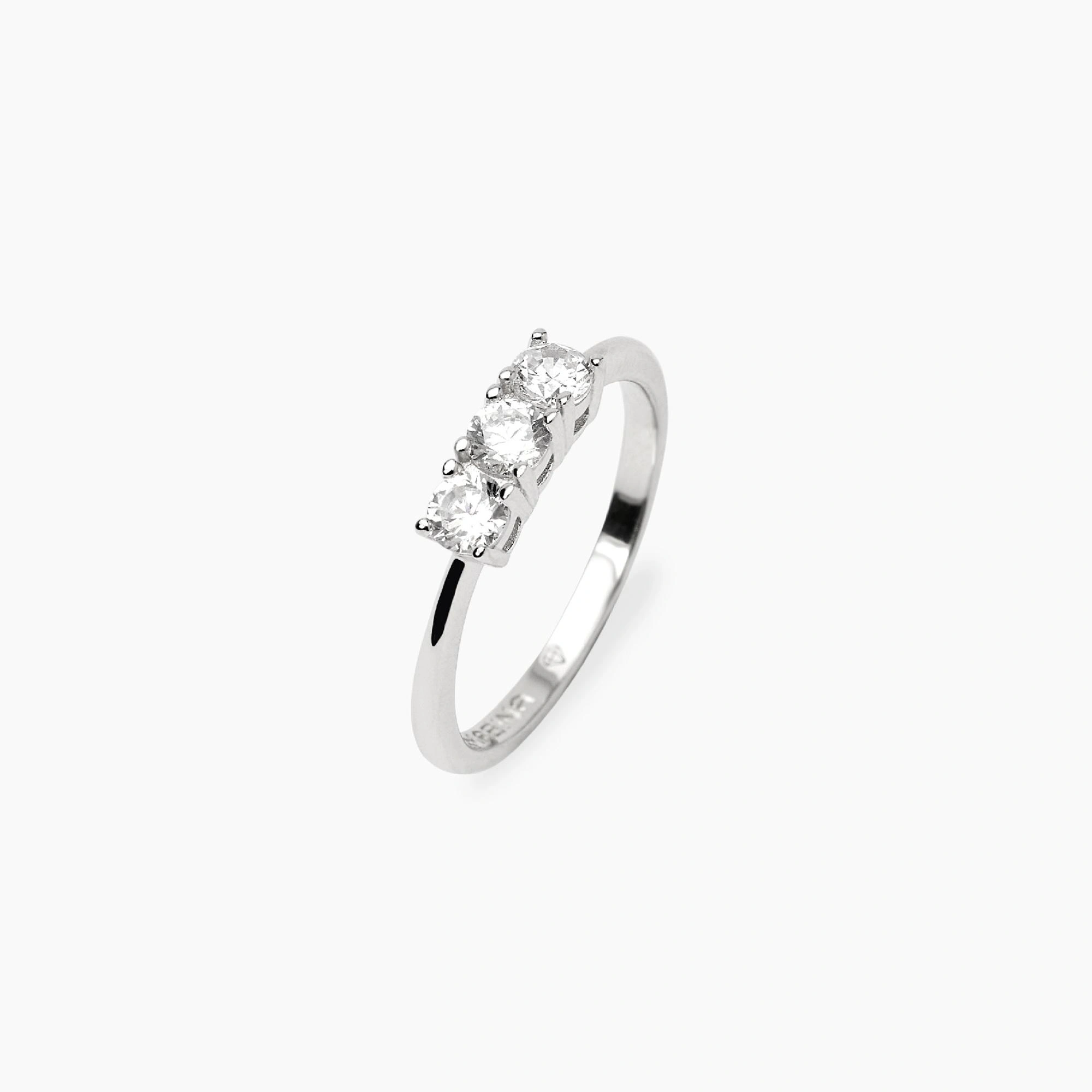 Anello trilogy in argento rodiato con diamanti lab-grown 0,15 ct ciascuno.
