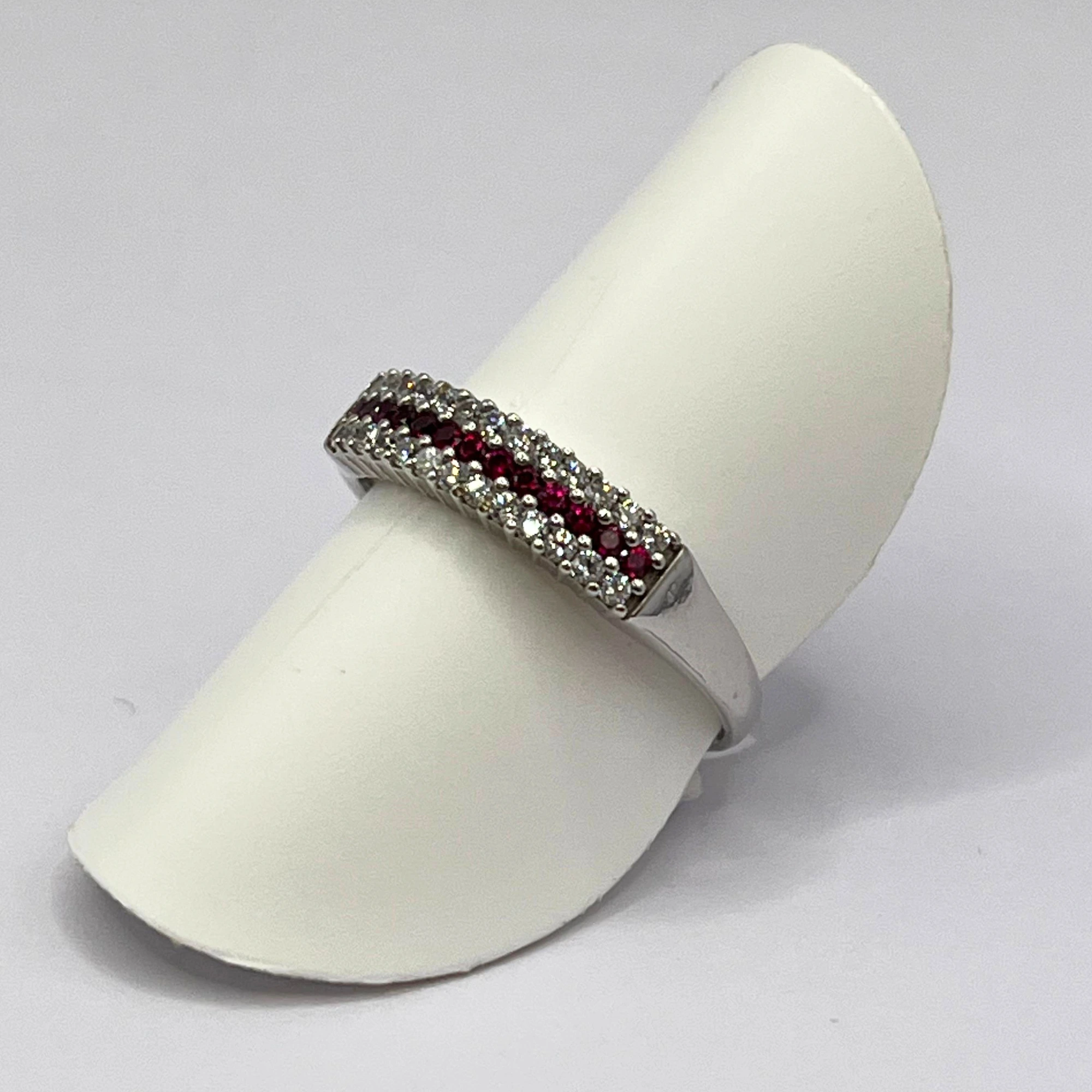 Anello da donna in oro bianco 18kt con rubini e zirconi.