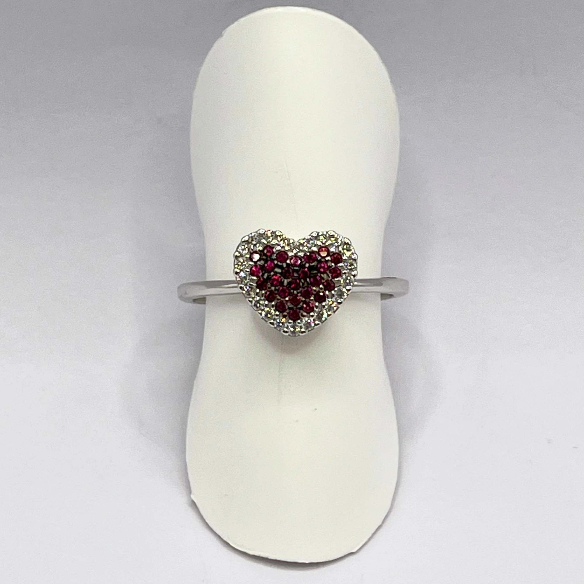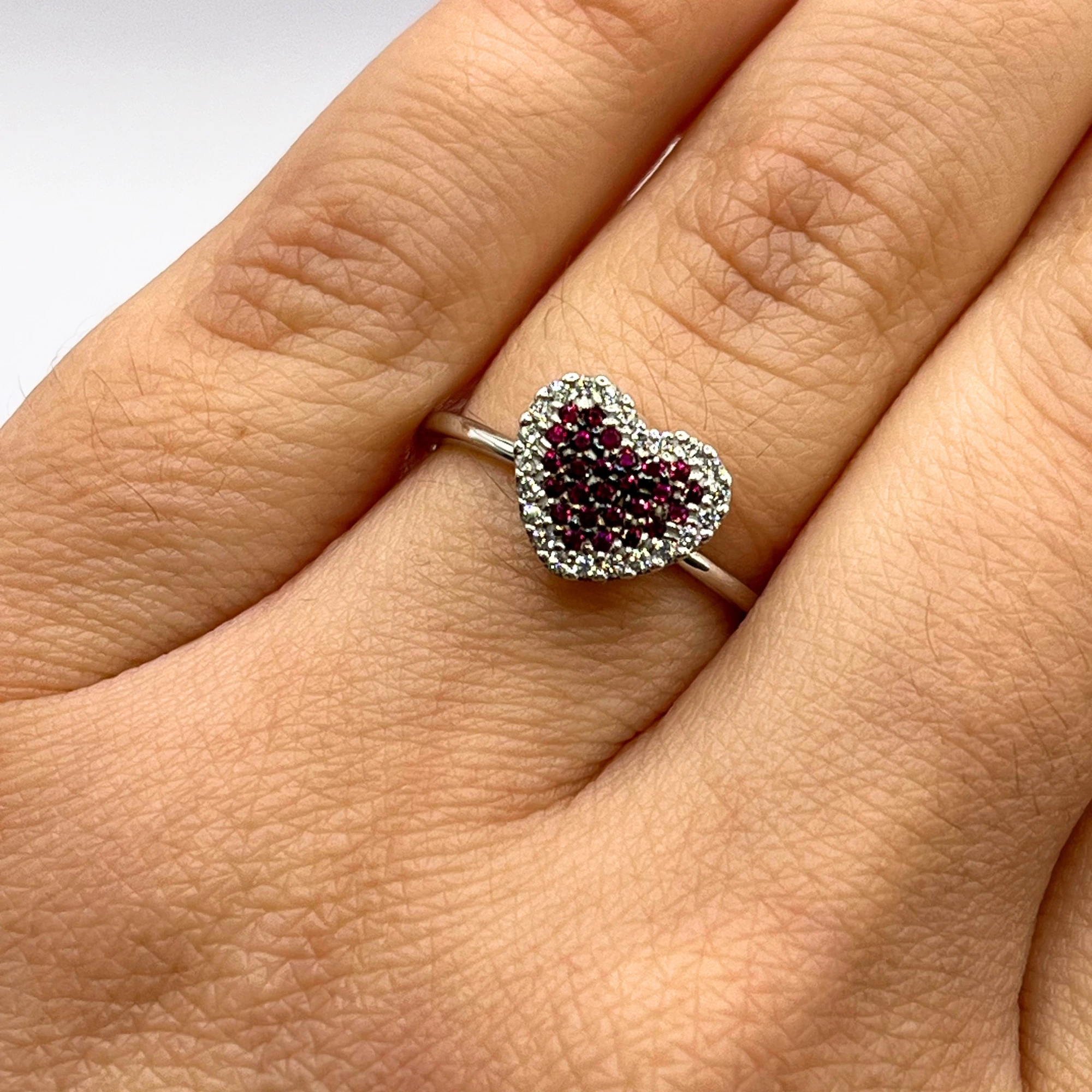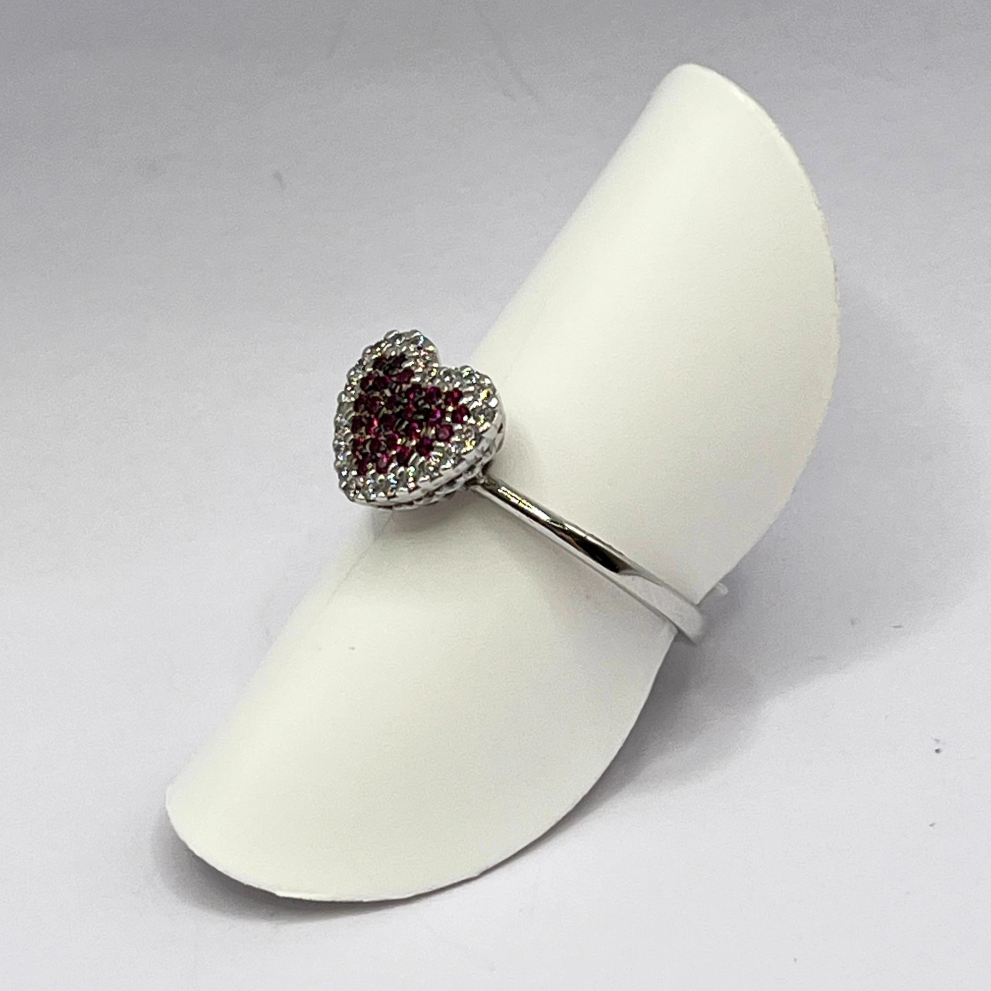 Anello da donna in oro bianco 18kt con centrale a forma di cuore composto da rubini e zirconi.