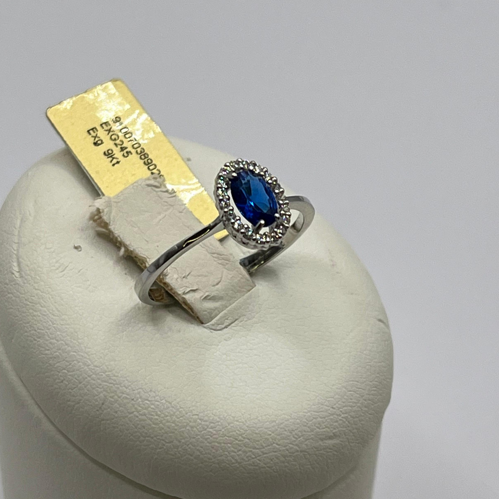 Pietra centrale ovale blu impreziosita da zirconi. Dimensione complessiva 9mm x 6mm.