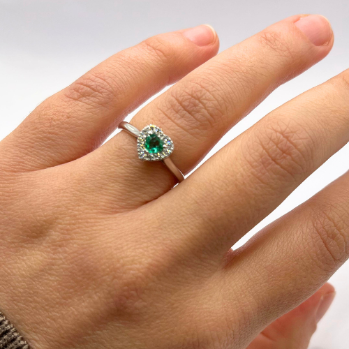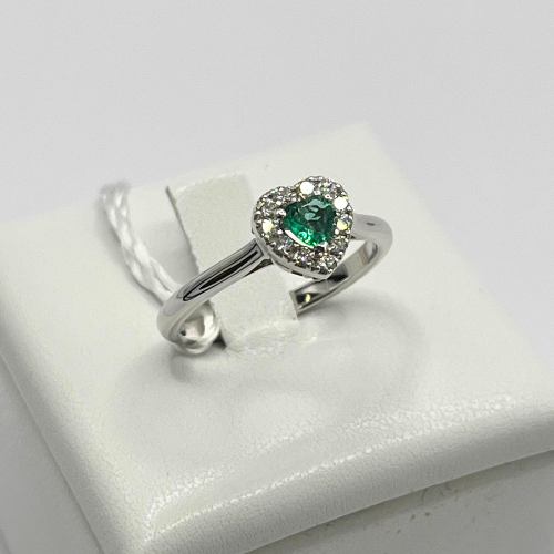 Anello donna in oro bianco 18kt con smeraldo a forma di cuore e diamanti.