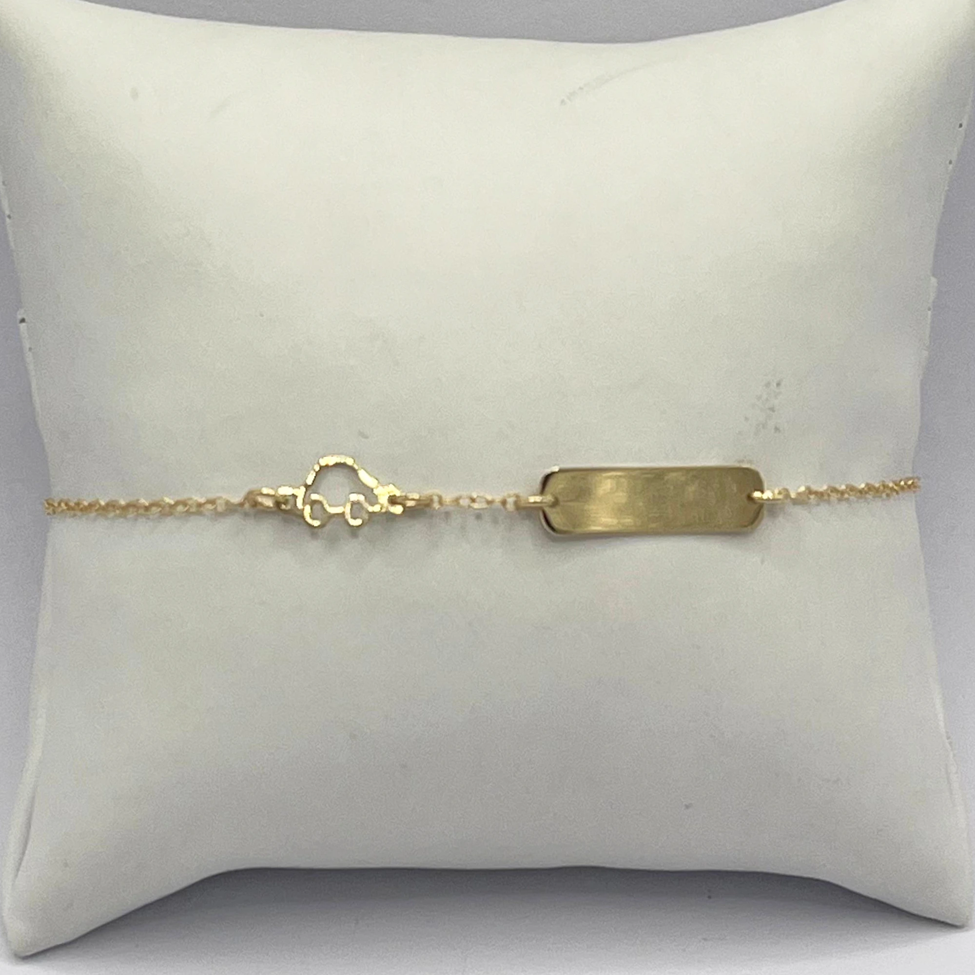Bracciale da bambino in oro giallo 9kt con simbolo macchinina e placca in oro per incisione personalizzata della dimensione di 1,8 cm.