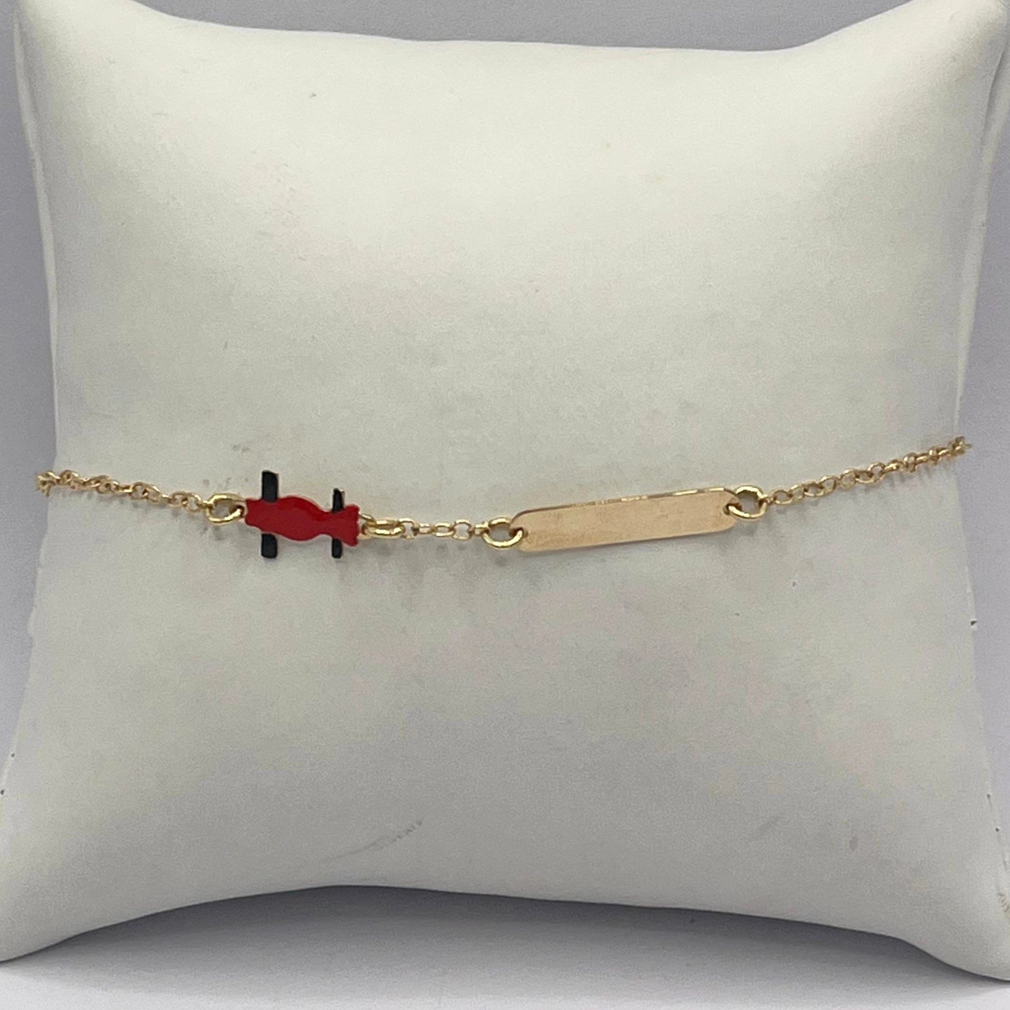 Bracciale in oro giallo 9kt con macchinina smaltata in rosso e nero e placca in oro per incisione personalizzata.