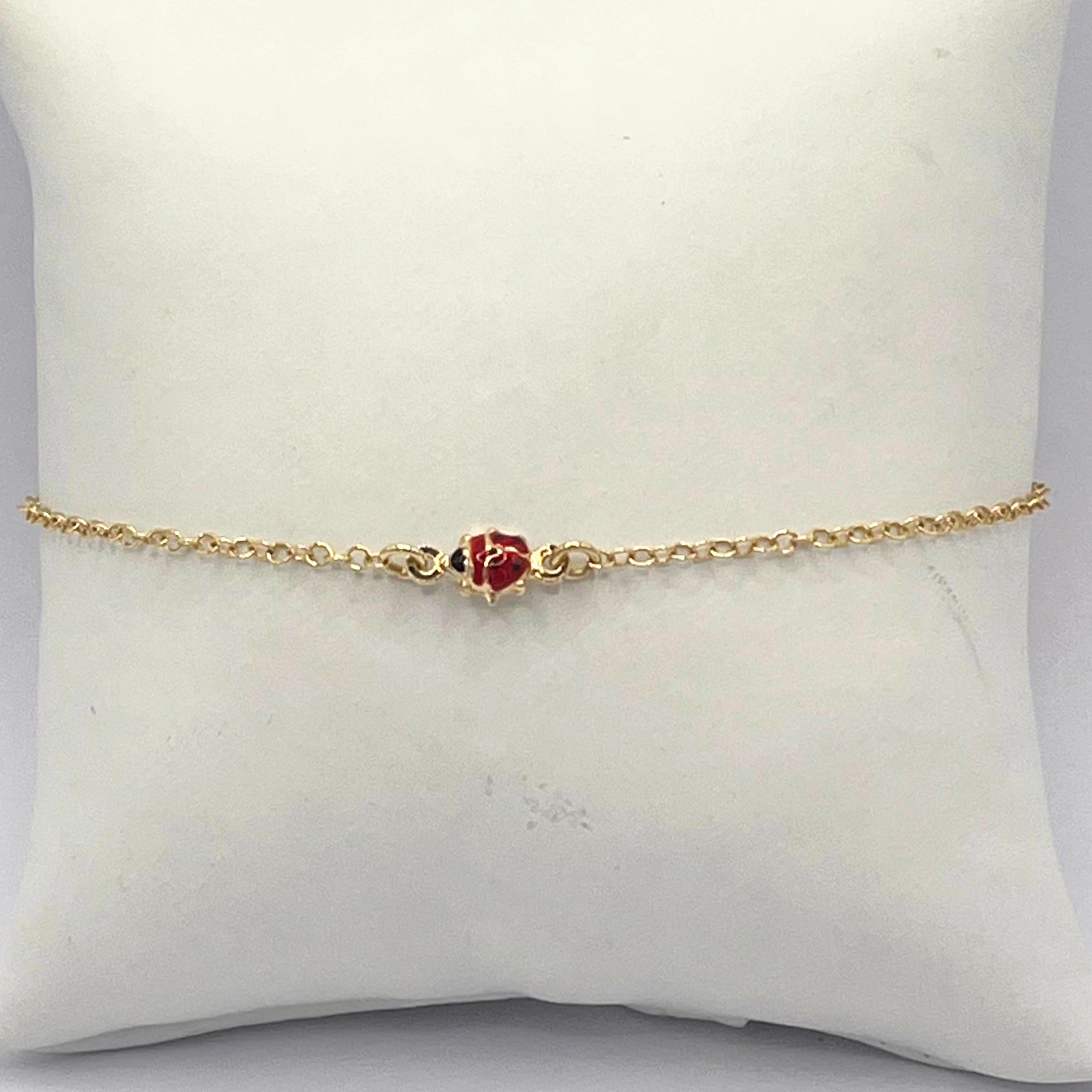 Bracciale da bambino in oro giallo 9 kt con coccinella in oro smaltata in rosso e nero.