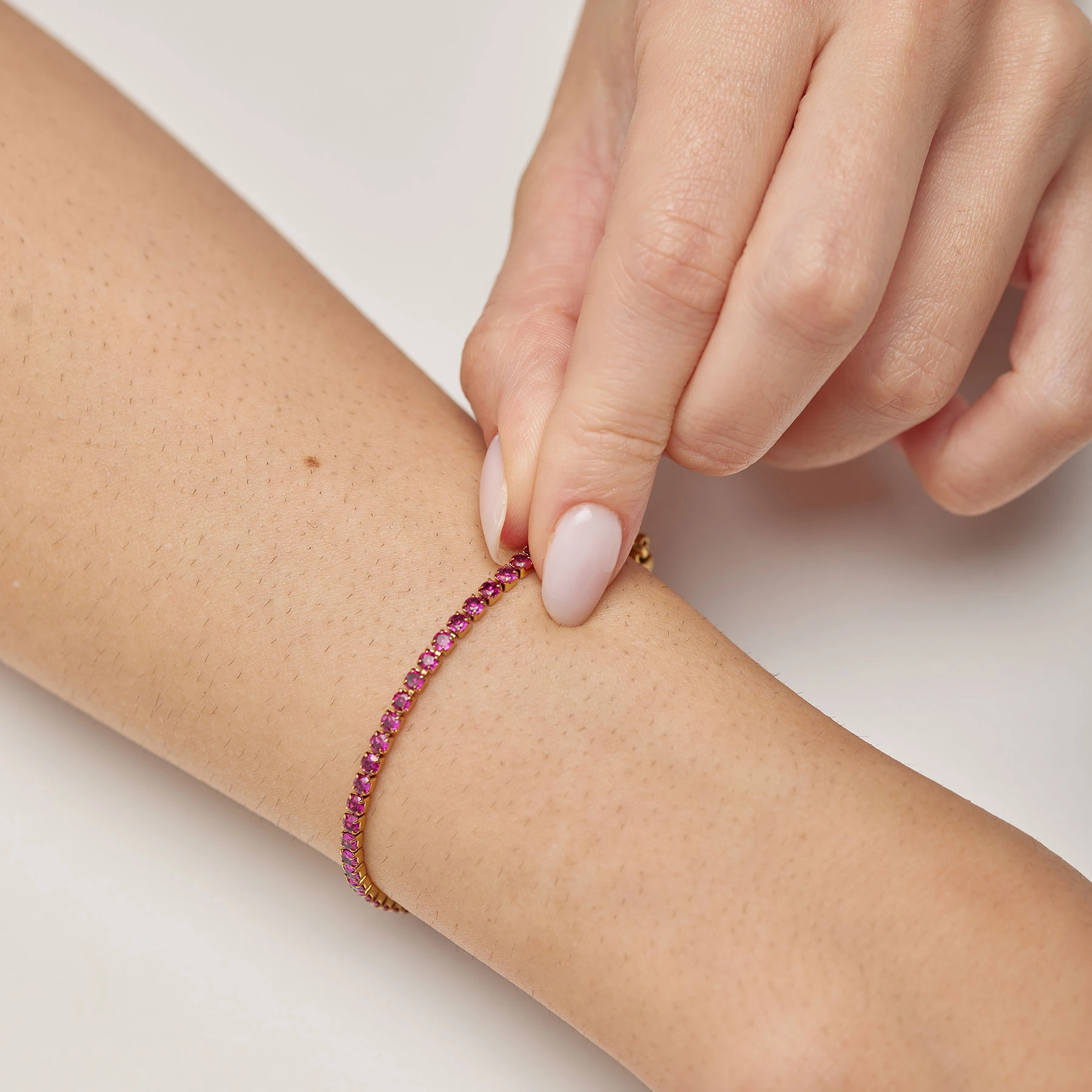 Bracciale tennis in acciaio 316L, finitura pvd oro 14K con cubic zirconia colore ruby.