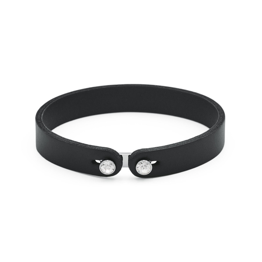 Bracciale in pelle nera con elemento chiusura a pressione in acciaio 316L e cristallo.