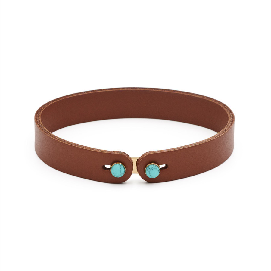 Bracciale in pelle color marrone con elemento chiusura a pressione in acciaio 316L, finitura pvd oro 14K e turchese ricostruito.