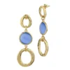 Bracciale in bronzo placcato oro giallo con cristalli effetto cabochon di colore blu marino tra moduli circolari martellati di diverse dimensioni.