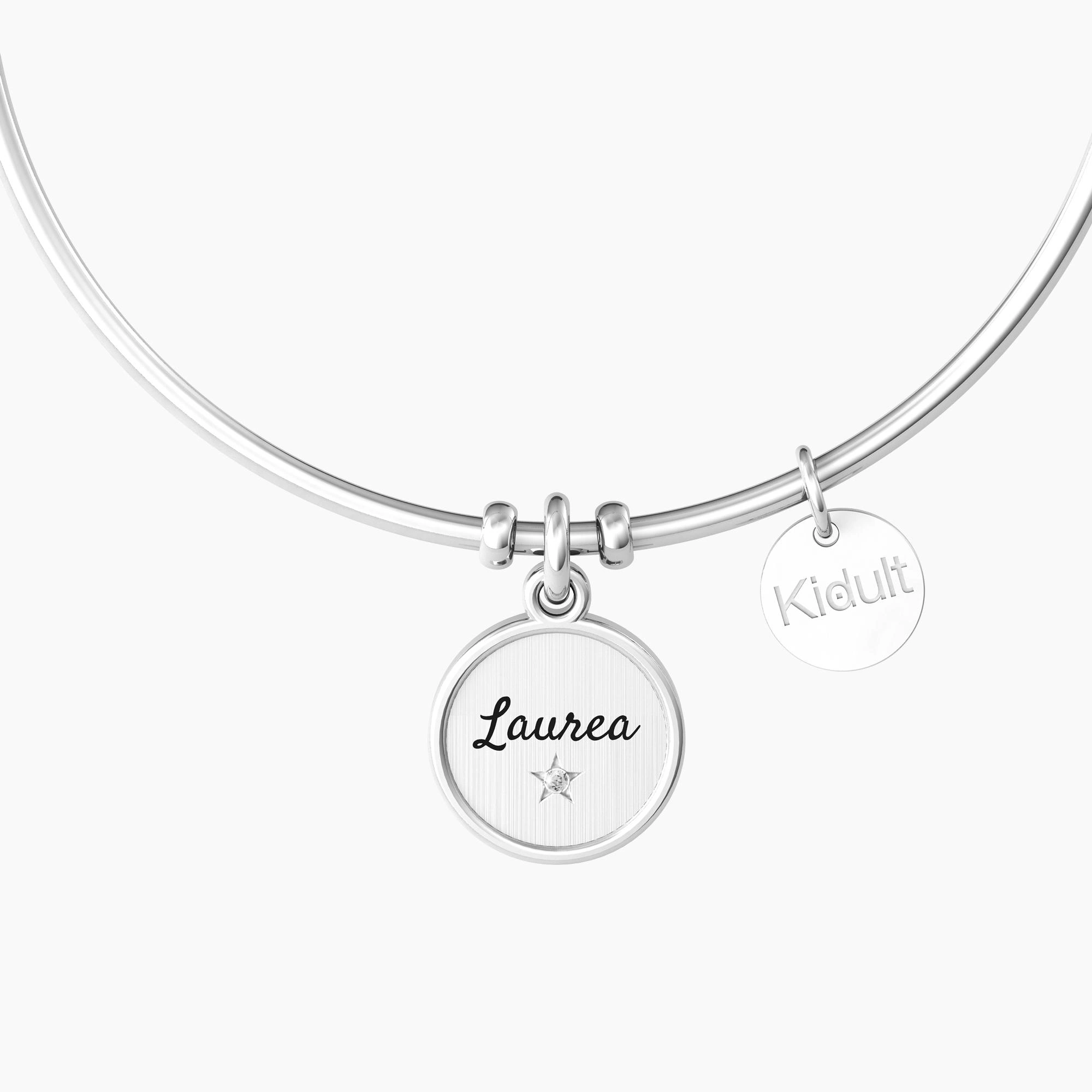 Bangle in acciaio con ciondolo tondo satinato, bordo lucido, smalto, cristallo bianco e scritta “Laurea”.