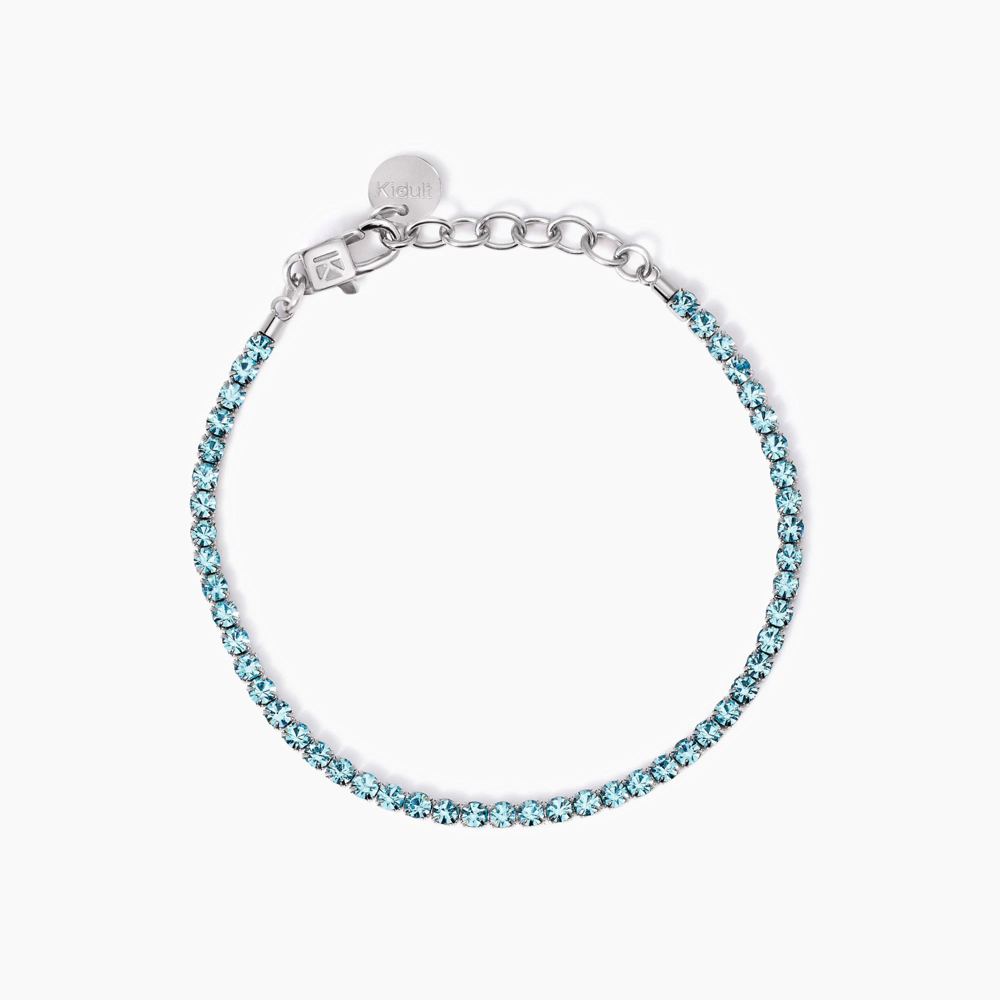 Bracciale tennis regolabile in acciaio con cristalli azzurri.