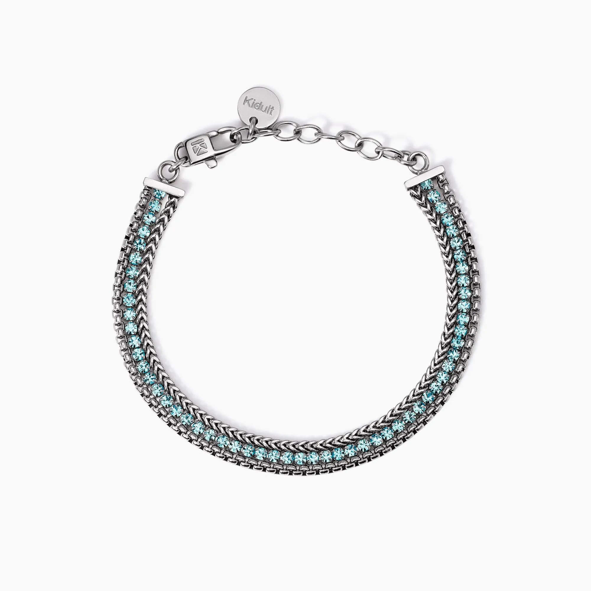 Bracciale regolabile in acciaio con due catene e tennis di cristalli azzurri.