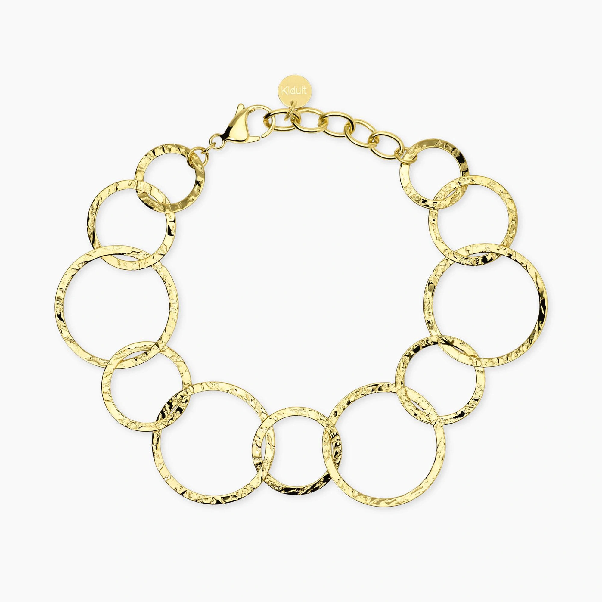 Bracciale regolabile con maglie rotonde in acciaio dorato martellato.