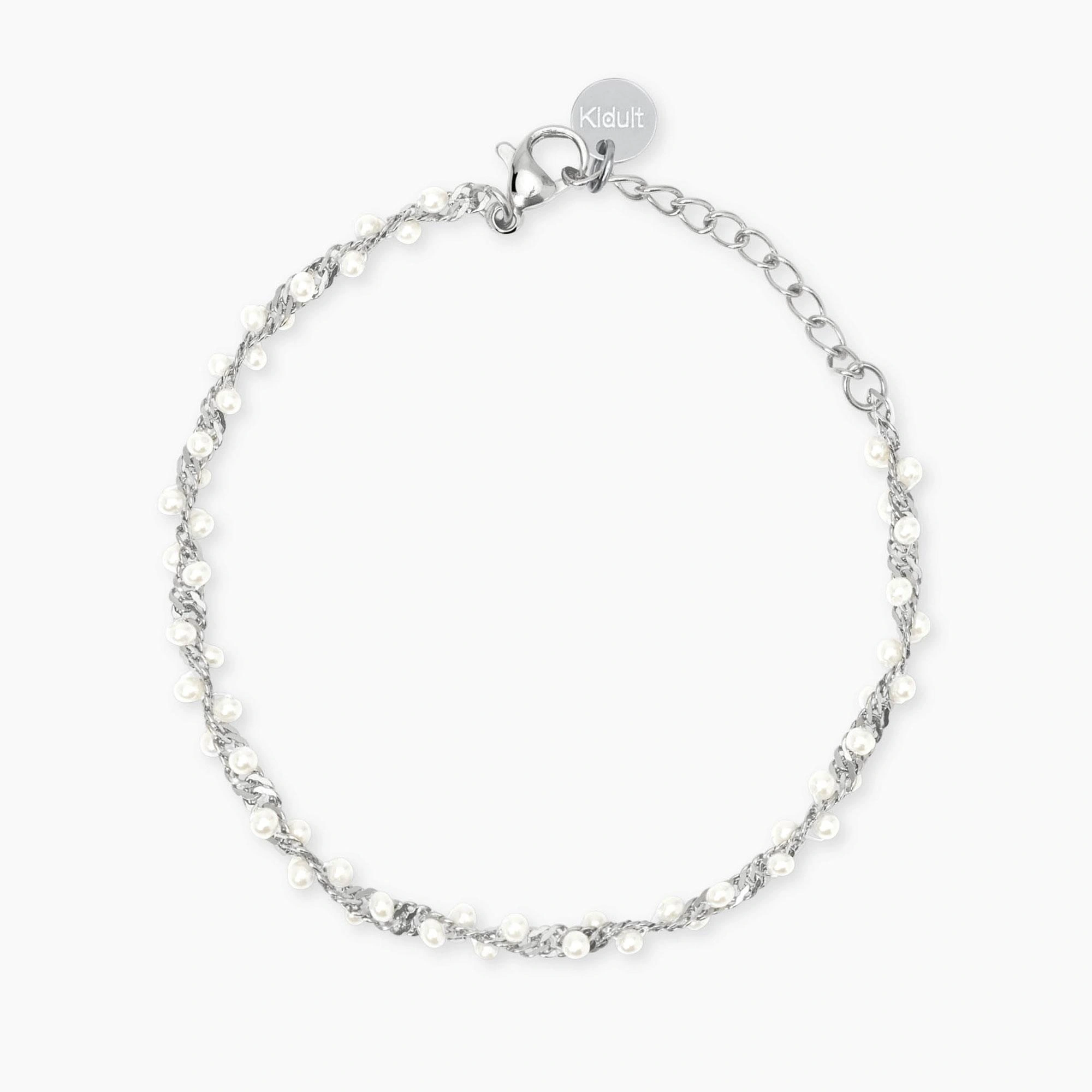 Bracciale regolabile in acciaio con catena groumette piatta e perle conchiglia.