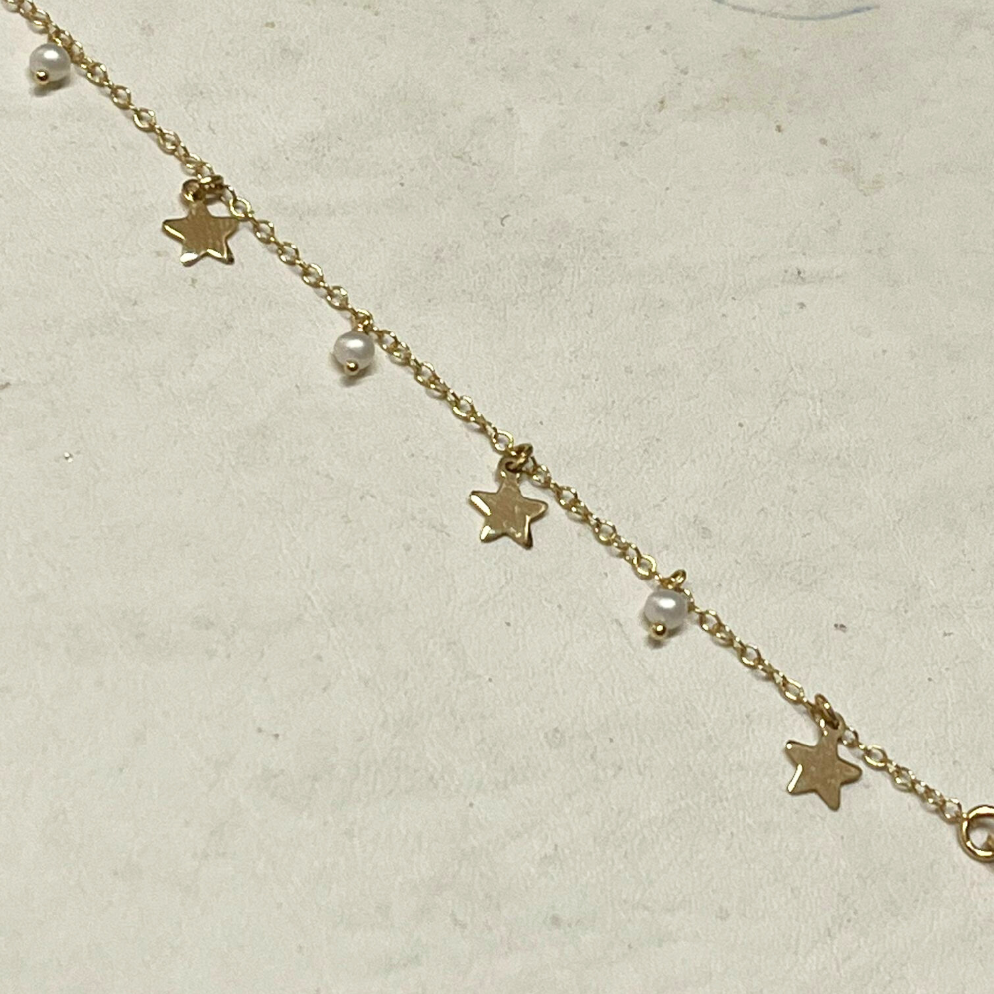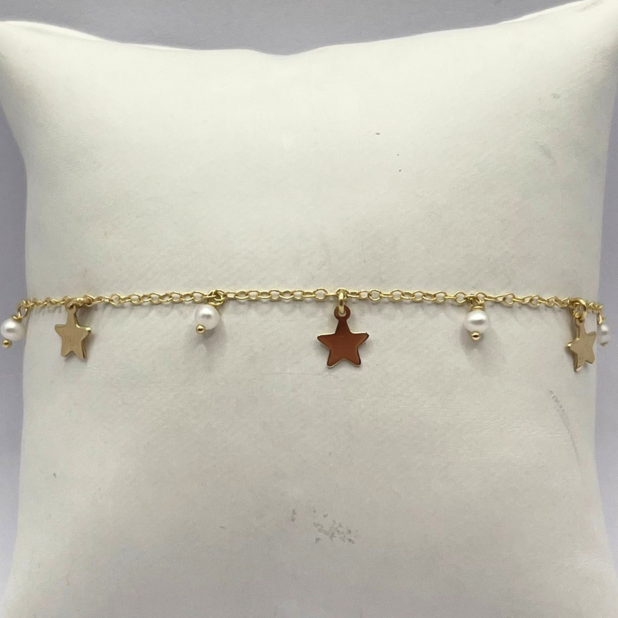 Bracciale in oro giallo 9kt con placche pendenti a forma di stellina alternate a perline pendenti.