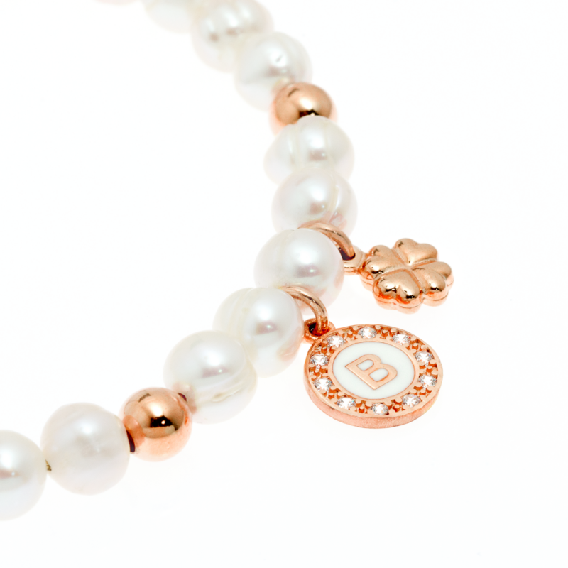 Bracciale Charlene in argento 925 con placcatura in oro rosa e perle di fiume naturali intervallate con sfere in argento dorato quadrifoglio e letterina pendente intercambiabile.