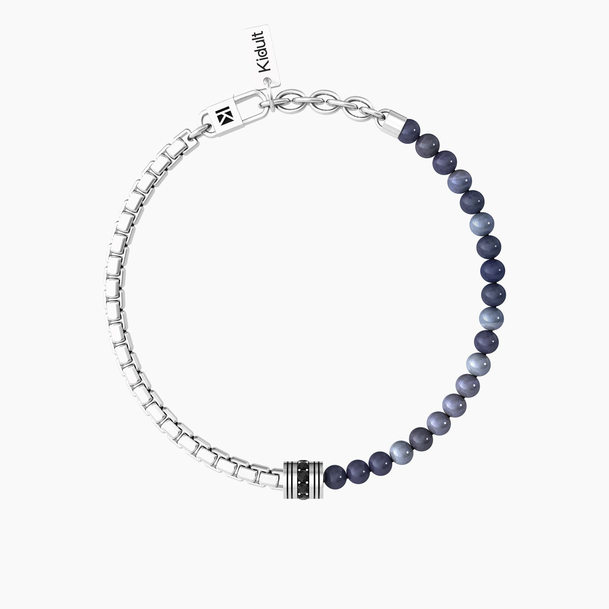 Bracciale da uomo regolabile in acciaio per metà con catena veneta e per metà con dumortierite blu e elemento con cristalli neri.