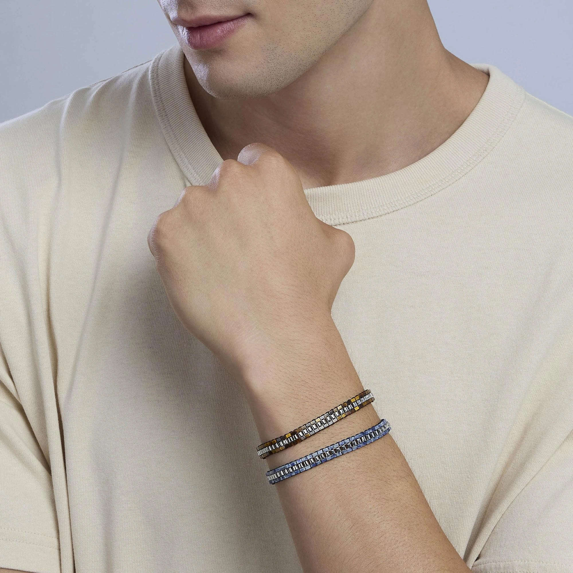 Bracciale regolabile in acciaio e PVD gunmetal, con elementi imperniati in ematite e occhio di tigre.