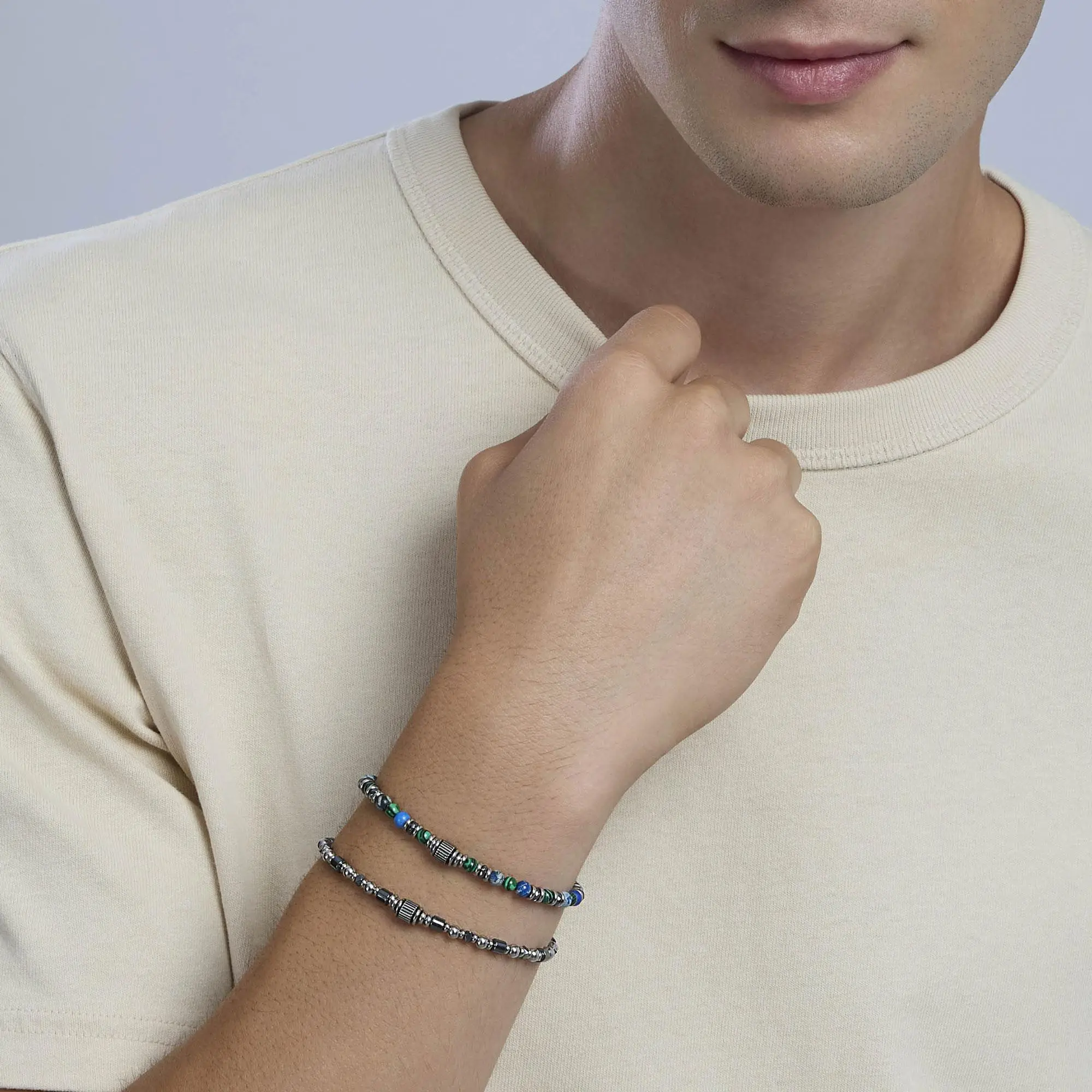 Bracciale regolabile in acciaio con elemento centrale, dischi faccettati in ematite e pietre multicolor.