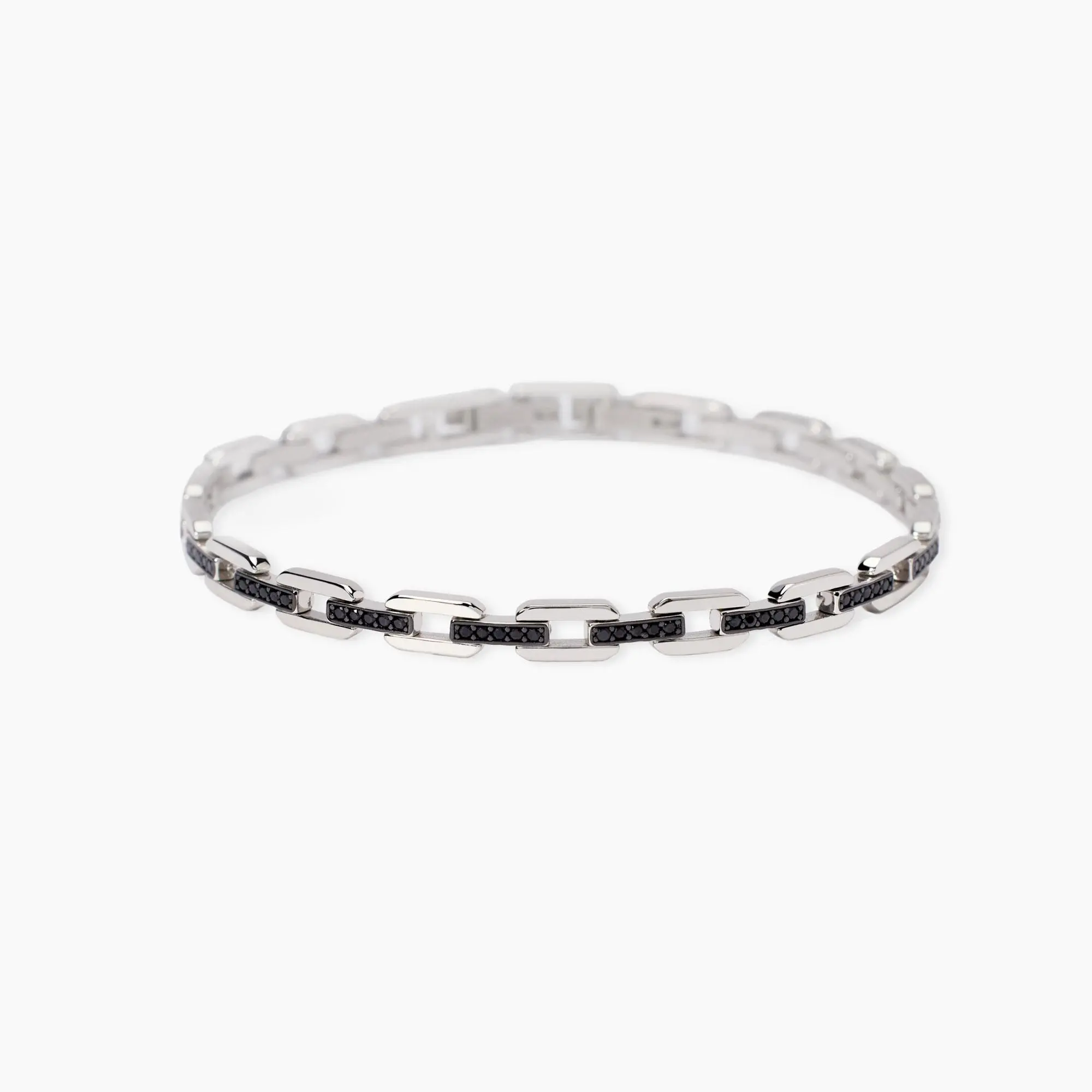 Bracciale in argento rodiato con catena a maglie imperniate e zirconi neri. Chiusura in acciaio.