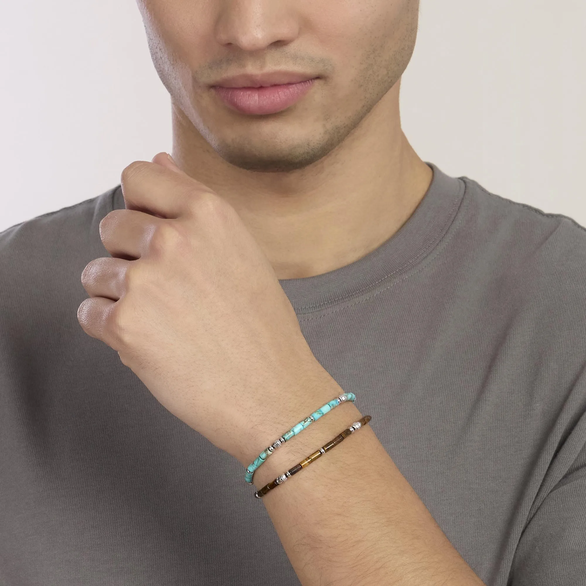Bracciale regolabile con sfere faccettate in argento rodiato e cilindri in occhio di tigre.