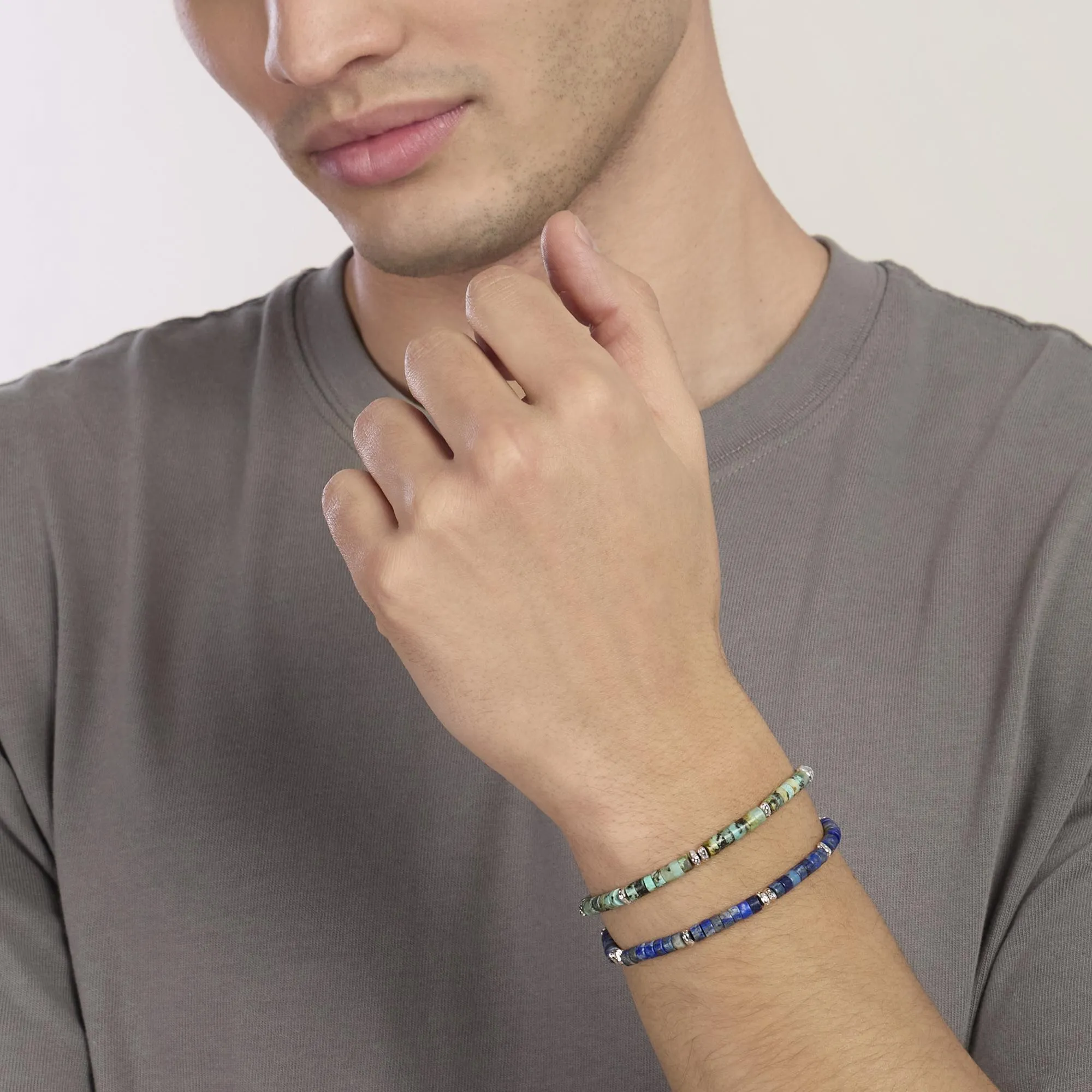 Bracciale regolabile con elementi in argento rodiato martellato e dischetti in turchese.