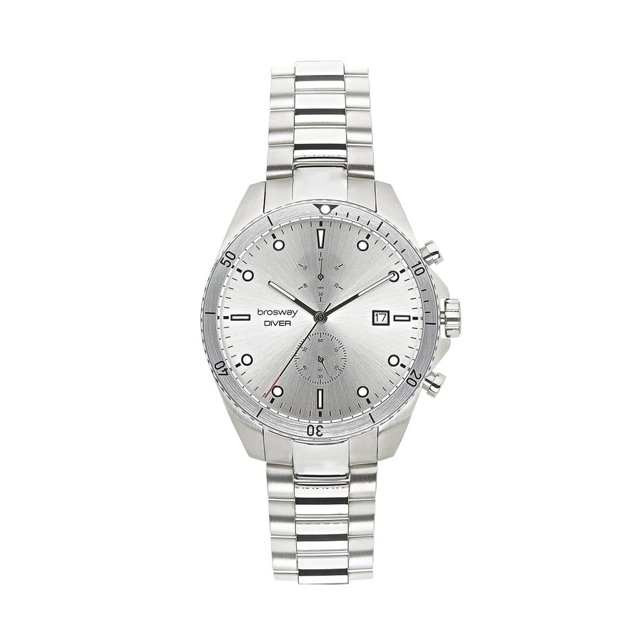 Orologio chrono in acciaio 304 con ghiera girevole, quadrante argento, cinturino in acciaio 304.