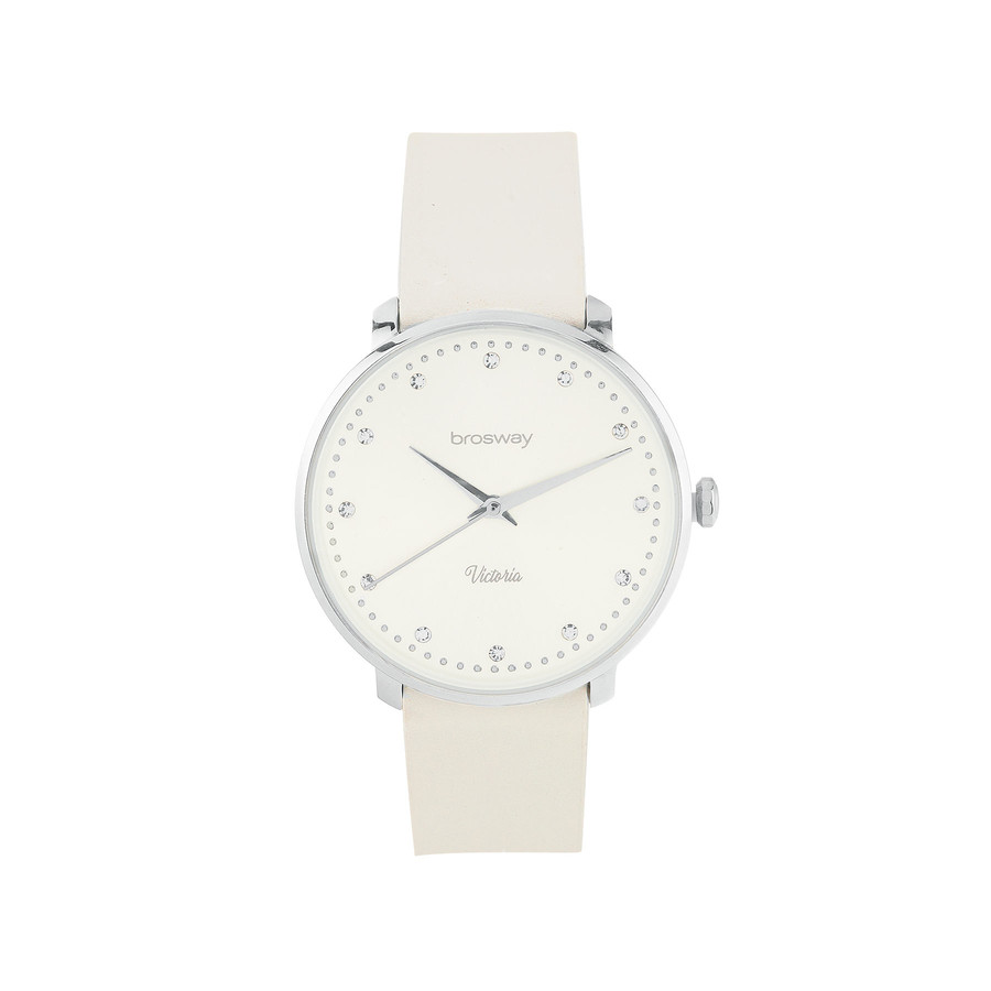Orologio solo tempo in acciaio 304, quadrante copper argentè con cristalli, cinturino in pelle colore grigio con fibbia in acciaio.