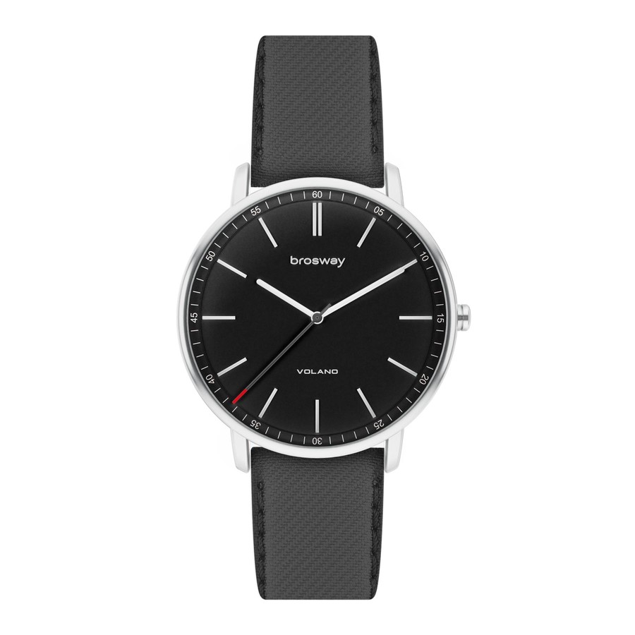 Orologio solo tempo in acciaio 304 con quadrante nero e cinturino in tessuto nero e interno in pelle naturale color arancione con fibbia in acciaio.