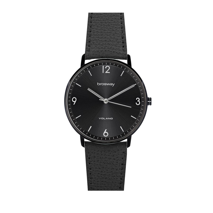 Orologio solo tempo in acciaio 304 e finitura pvd colore nero con quadrante nero sunray, cinturino in pelle nera, fibbia in acciaio 304 e finitura pvd colore nero satinato.