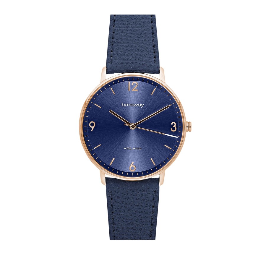 Orologio solo tempo in acciaio 304 e finitura pvd oro rosa 14K con quadrante blu sunray, cinturino in pelle blu, fibbia in acciaio 304 e finitura pvd oro rosa 14K