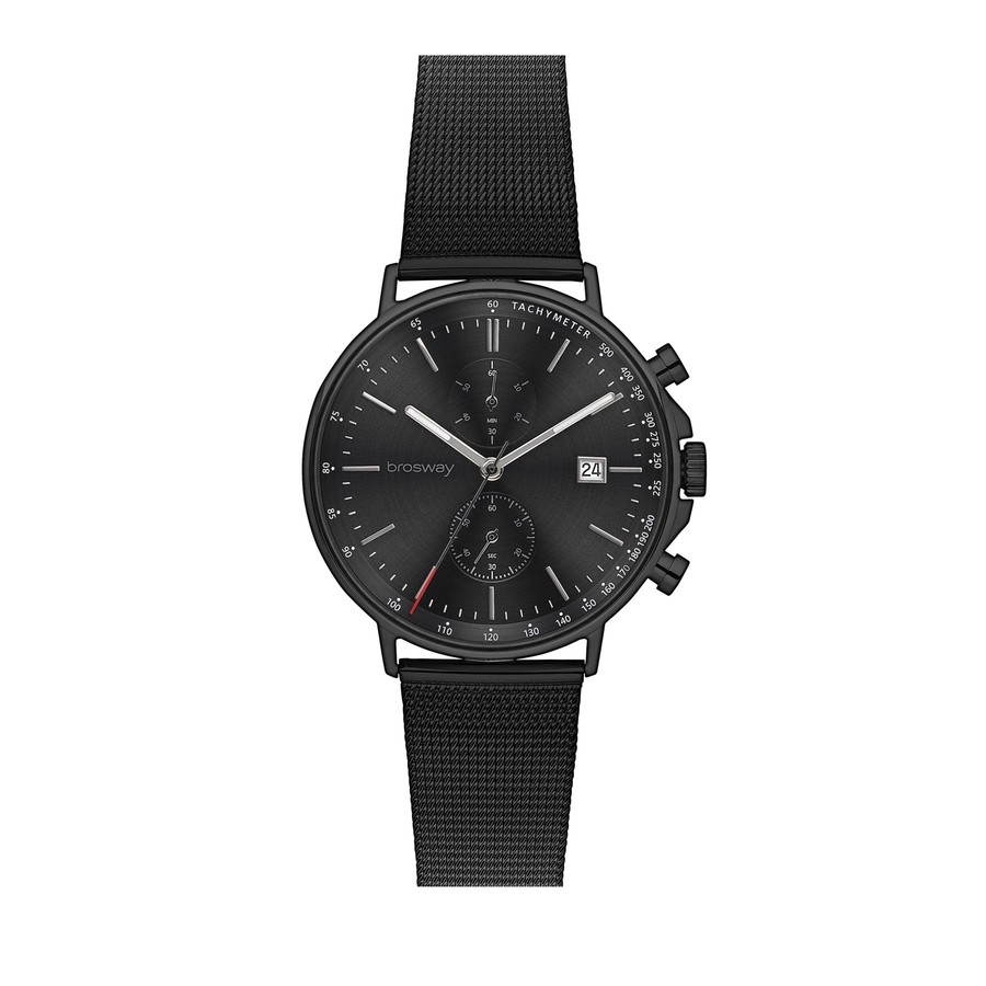 Orologio chrono in acciaio 304 e finitura pvd colore nero con quadrante sunray nero, cinturino in acciaio 304 maglia milano nera.