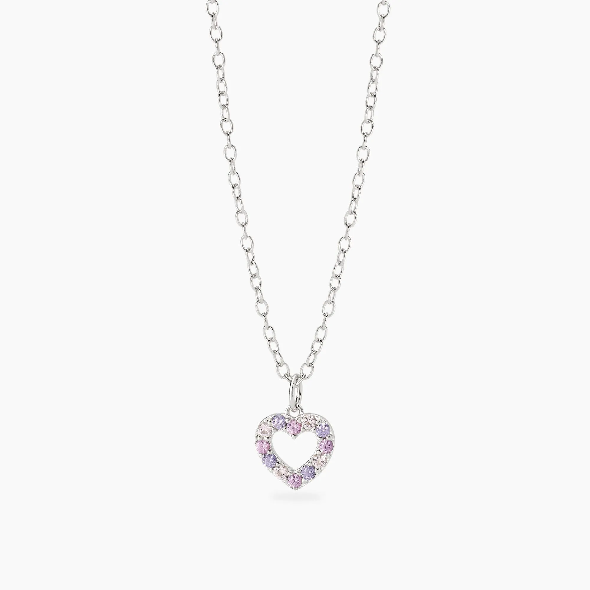 Collana regolabile da bambina con catena rolò in argento rodiato con pendente cuore in tormaline rosa sintetiche e zirconi.