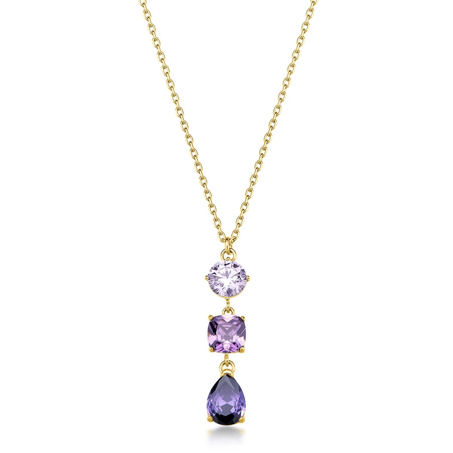 Collana girocollo in acciaio 316L e finitura pvd oro 14K, con pendente con round, cushion e pear cubic zirconia colore ametista.