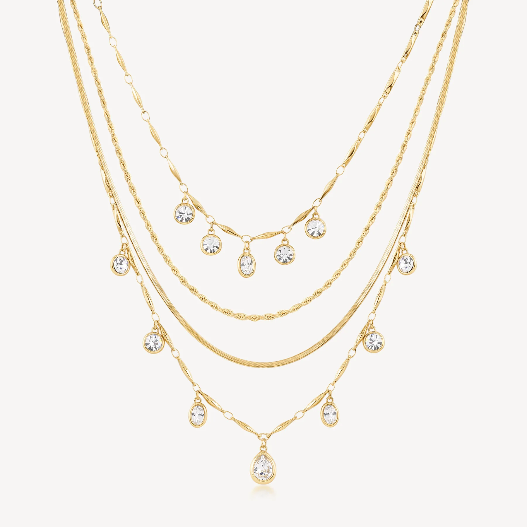 Collana multifilo in acciaio 316L e finitura pvd oro 14K con cristalli a forma di goccia, ovale e tondo.