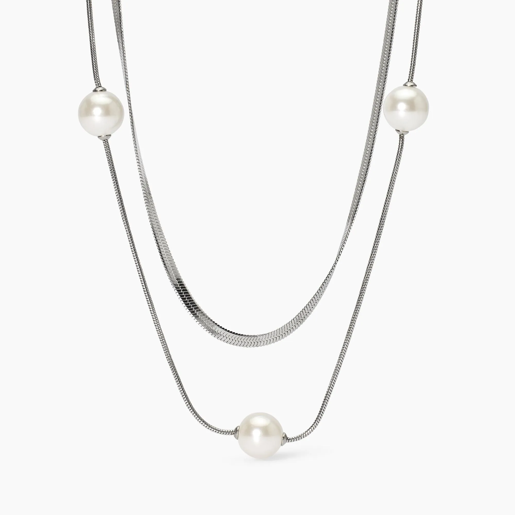 Collana in acciaio con catena herringbone e snake con perle conchiglia.
