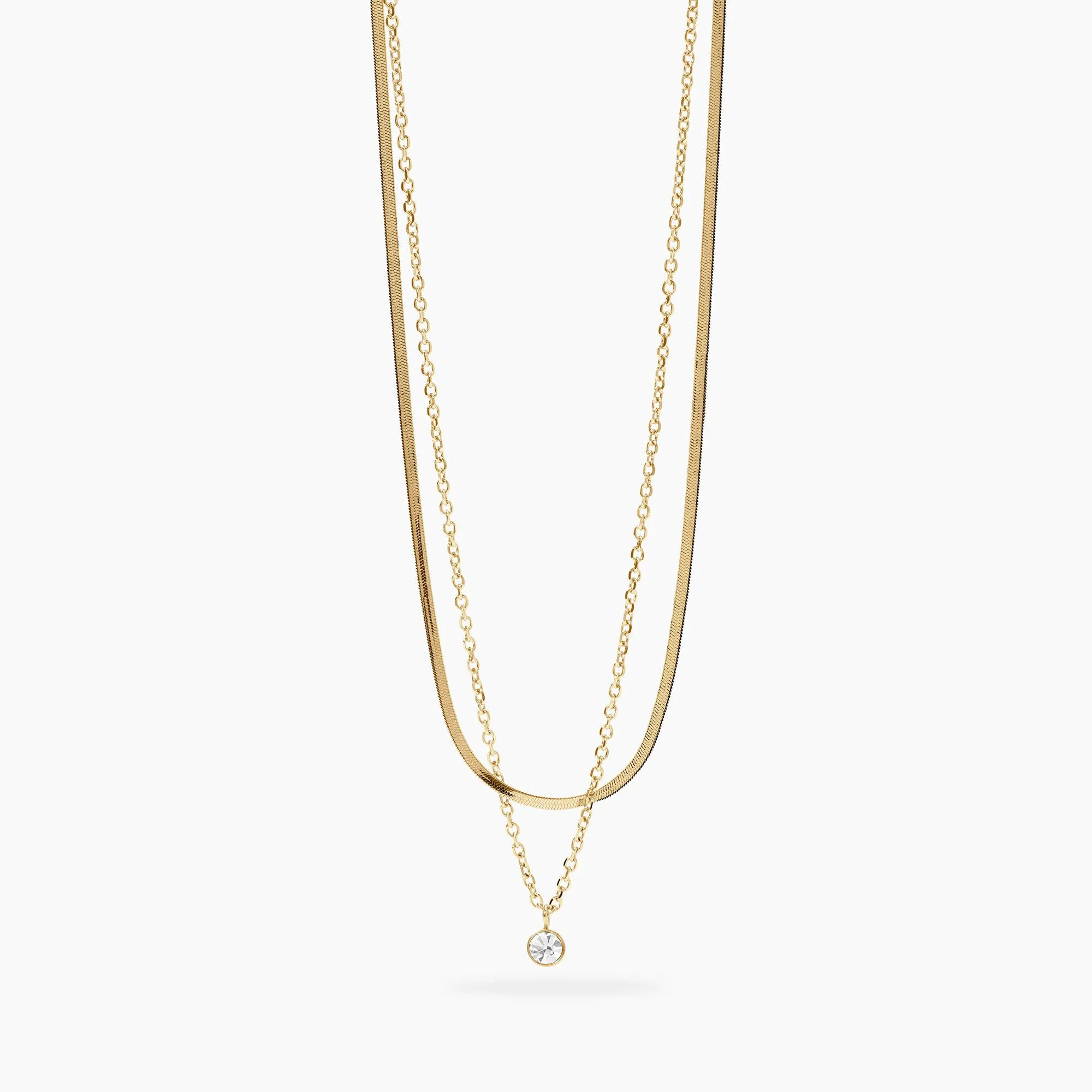 Girocollo regolabile in acciaio dorato con catene forzatina diamantata e herringbone, e punto luce in cristallo.