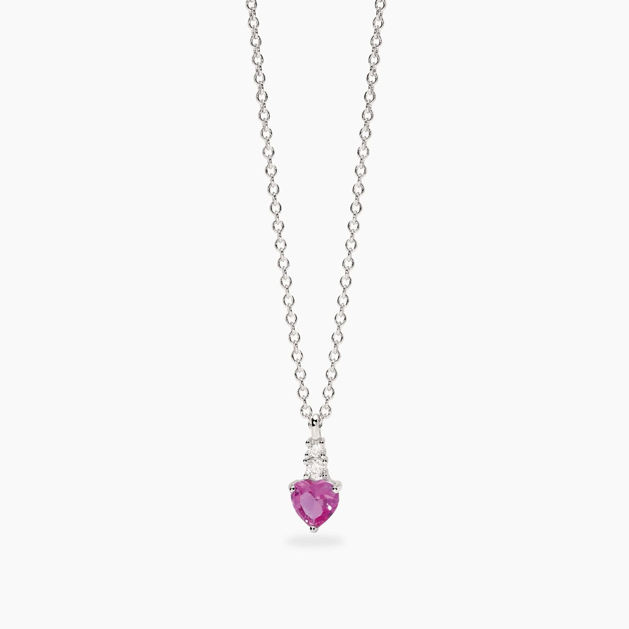 Girocollo regolabile con catena rolò in argento rodiato e pendente con zirconi cuore in corindone rosa sintetico.