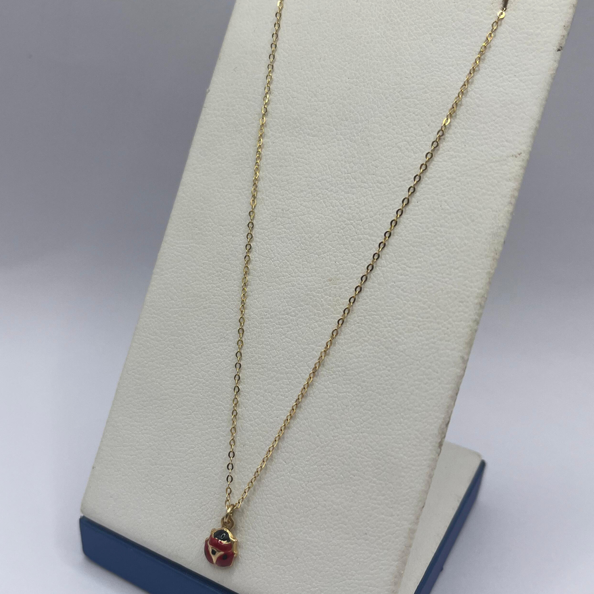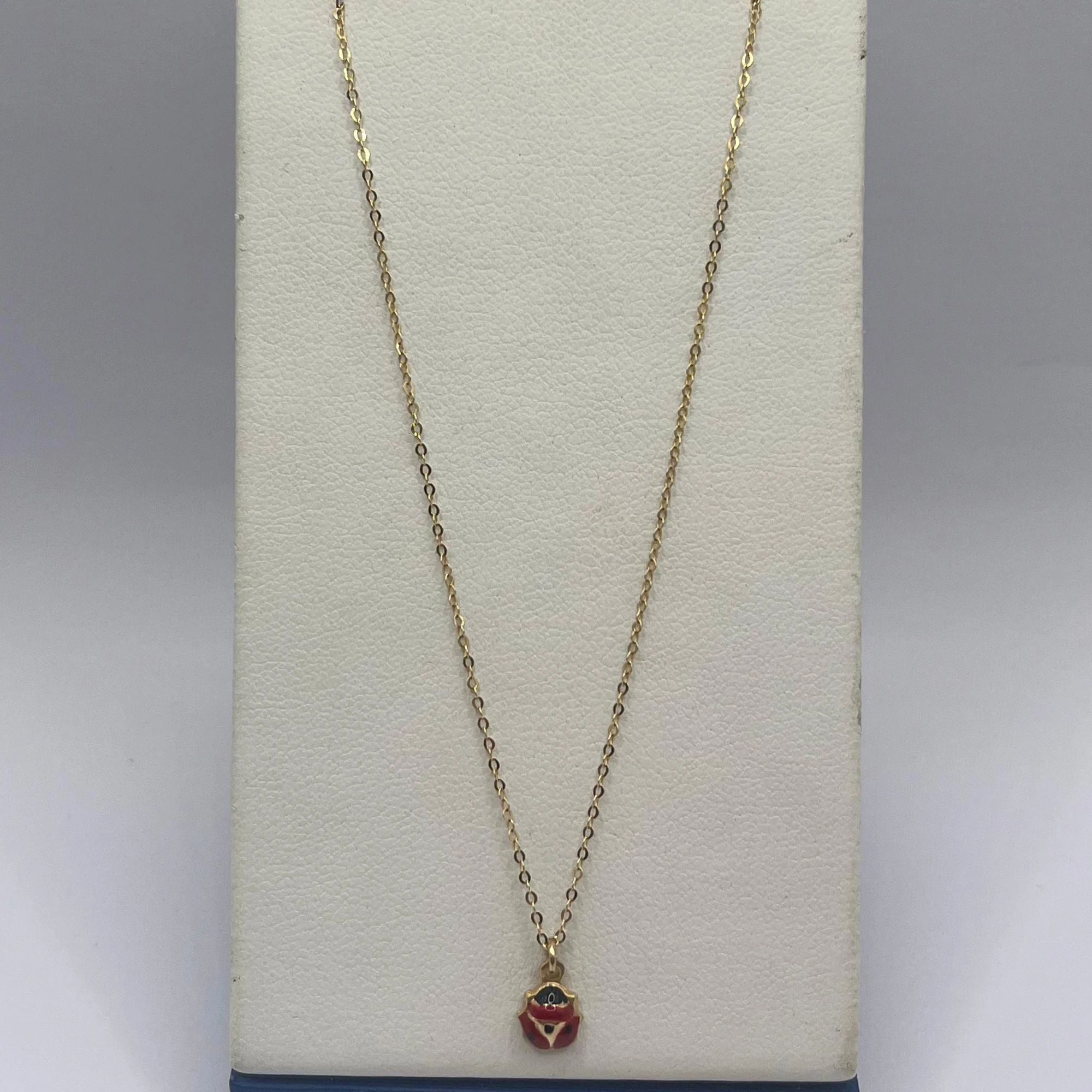 Collana da donna in oro giallo 9kt con pendente smaltato in rosso e nero a forma di coccinella.