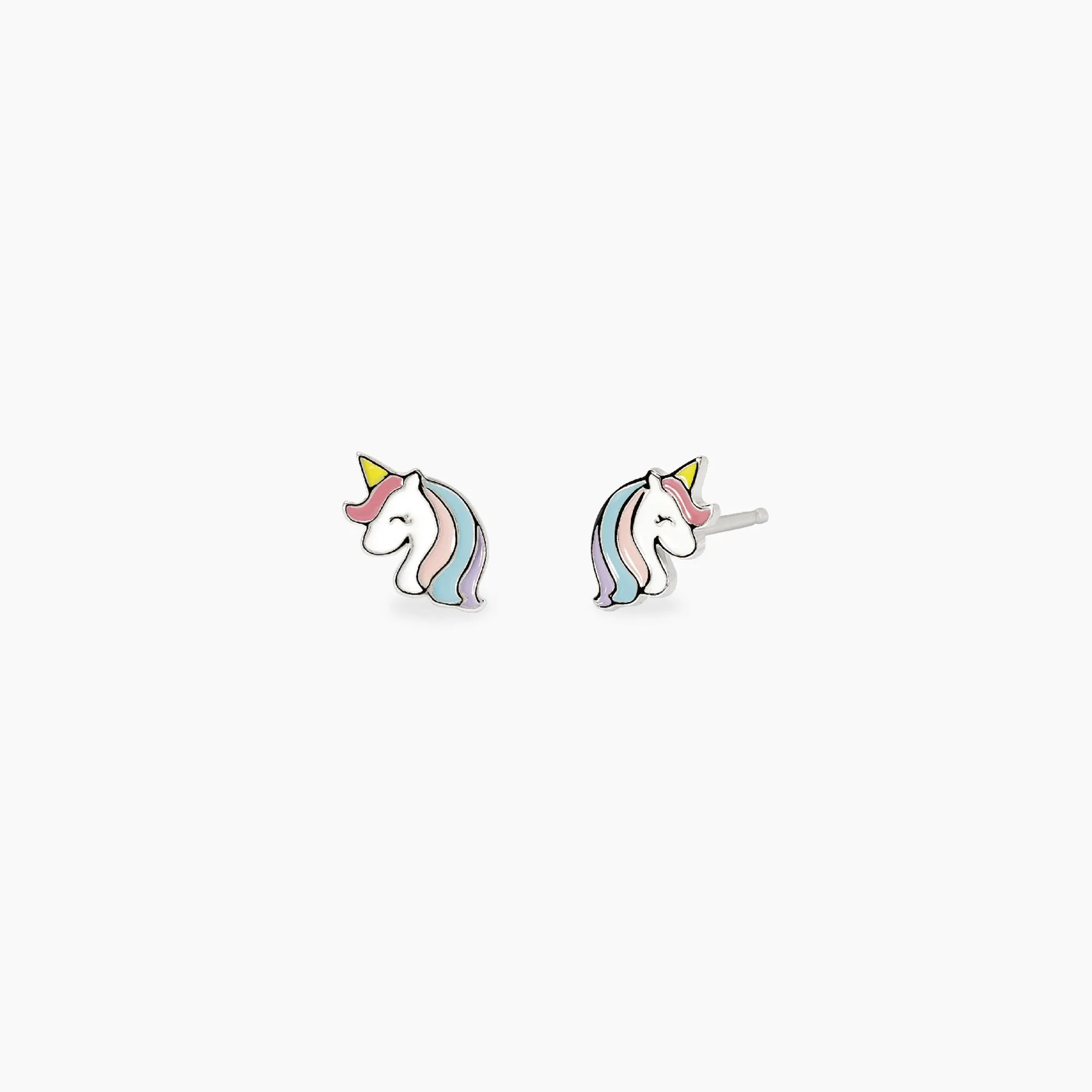 Orecchini da bambina in argento rodiato con unicorno smaltato.