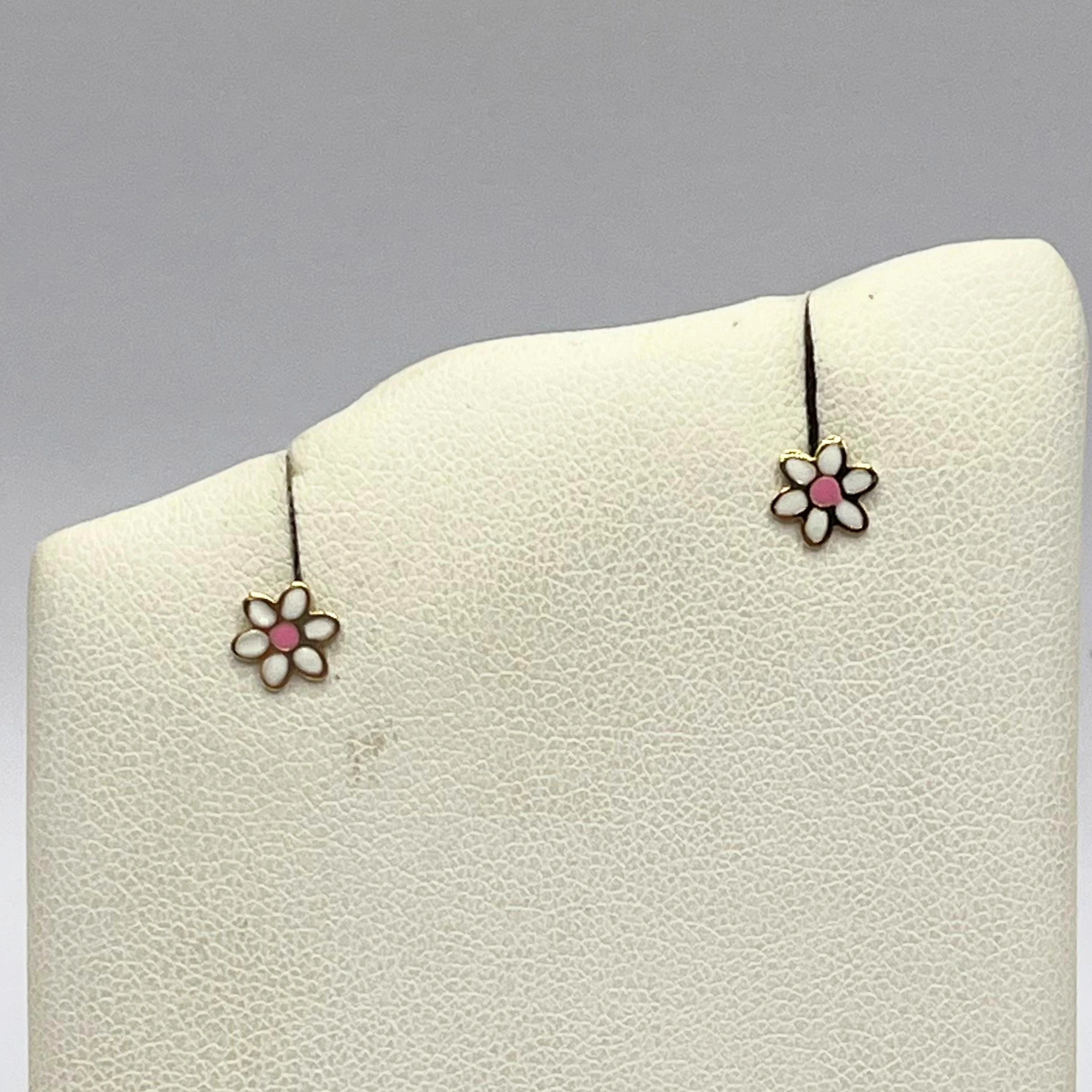 Orecchini a lobo da bambina in oro giallo 9kt a forma di fiore smaltato in bianco e rosa.