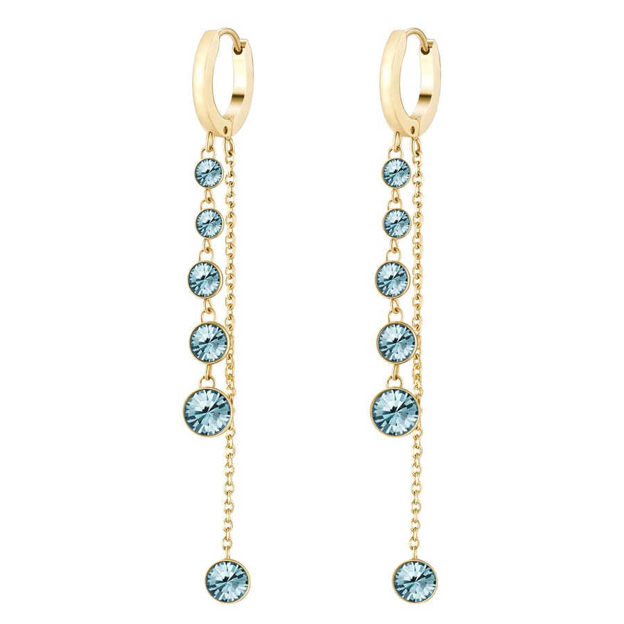Orecchini in acciaio 316L e finitura pvd oro 14K con pendenti e cristalli colore smoked sapphire.
