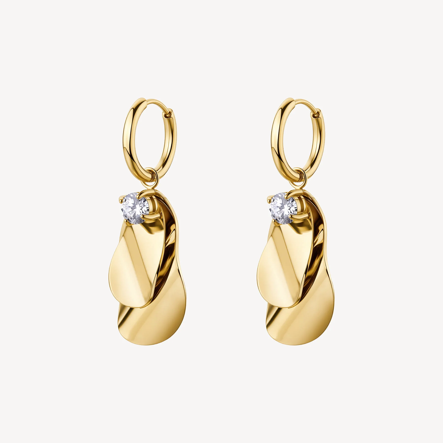 Orecchini a cerchietto in acciaio 316L e finitura pvd oro 14K con pendenti e cristallo.