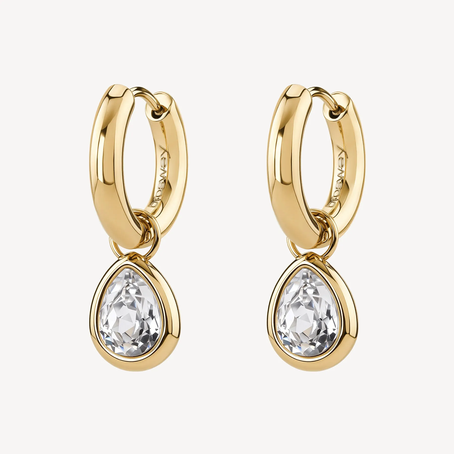 Orecchini a cerchietto in acciaio 316L e finitura pvd oro 14K con cristalli a forma di goccia.