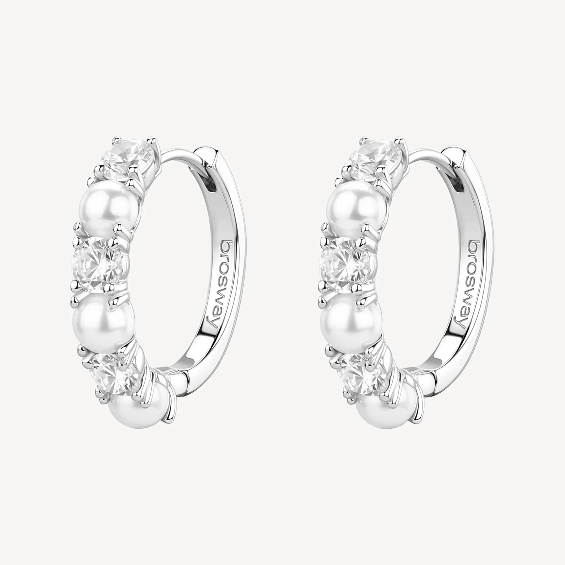 Orecchini a cerchio in argento rodiato 925‰ con perle di conchiglia e cubic zirconia.