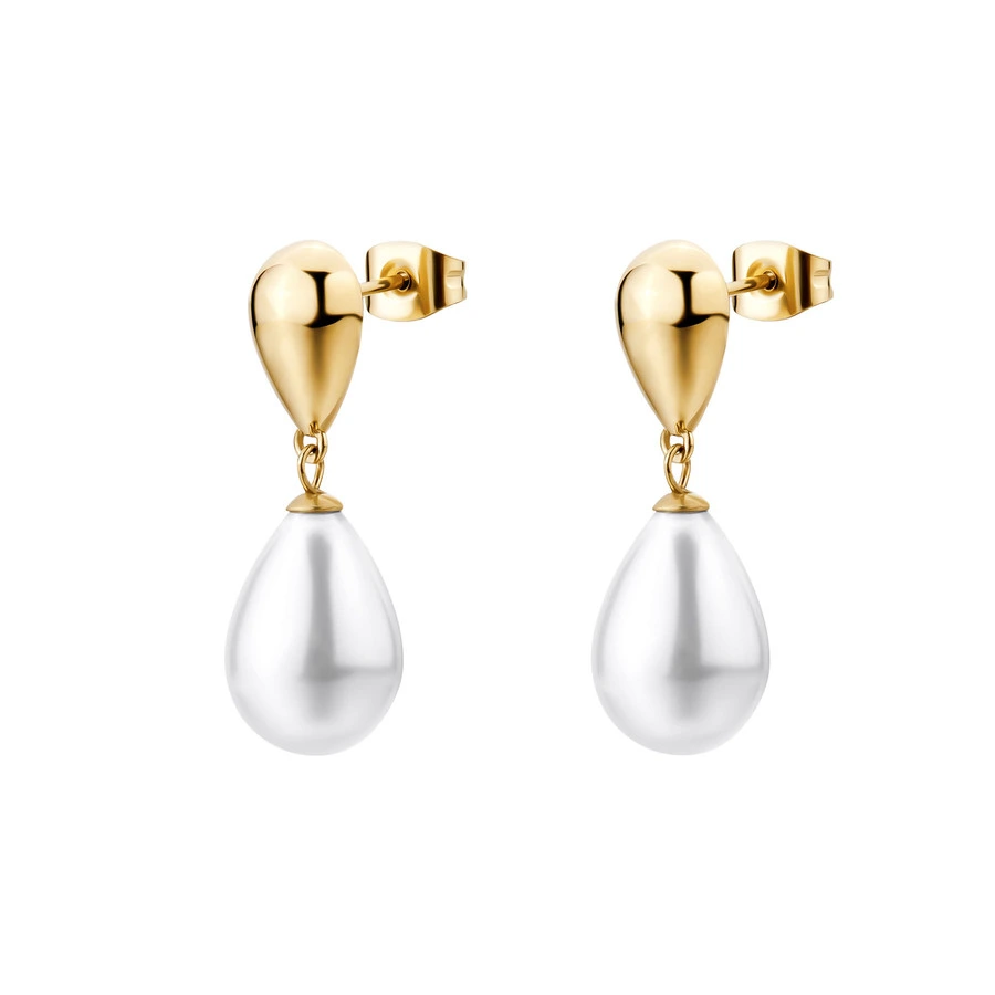 Orecchini pendenti in acciaio 316L e finitura pvd oro 14K, con perle di conchiglia.