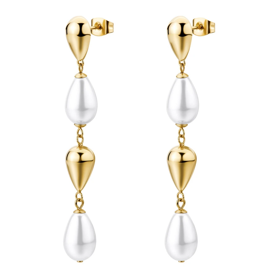 Orecchini pendenti in acciaio 316L e finitura pvd oro 14K, con perle di conchiglia.