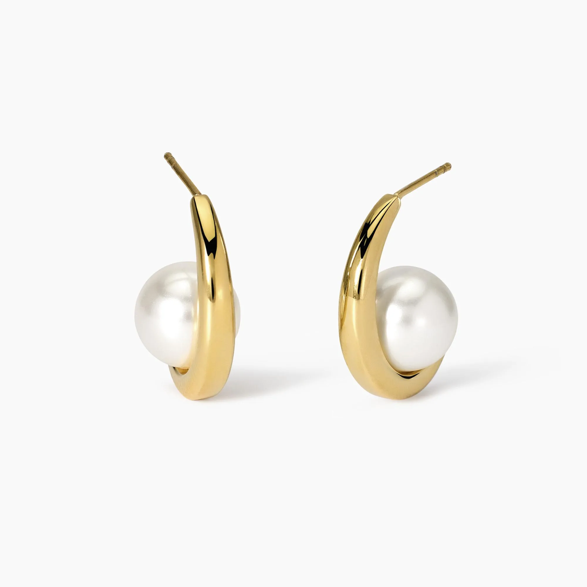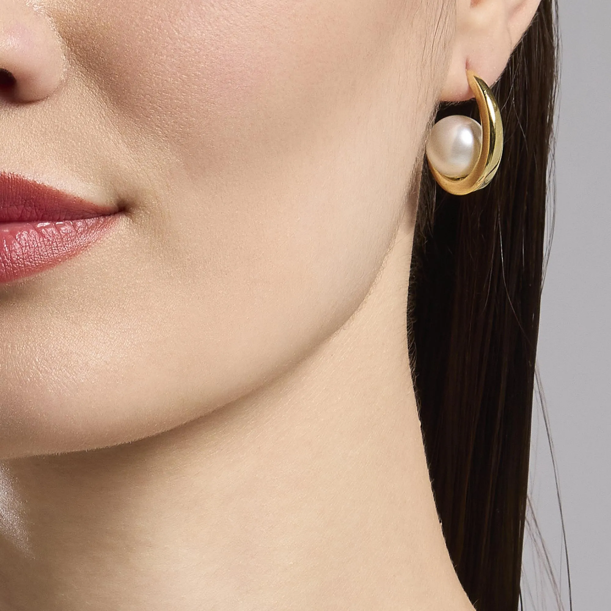 Orecchini semicerchio in acciaio dorato e perle conchiglia.