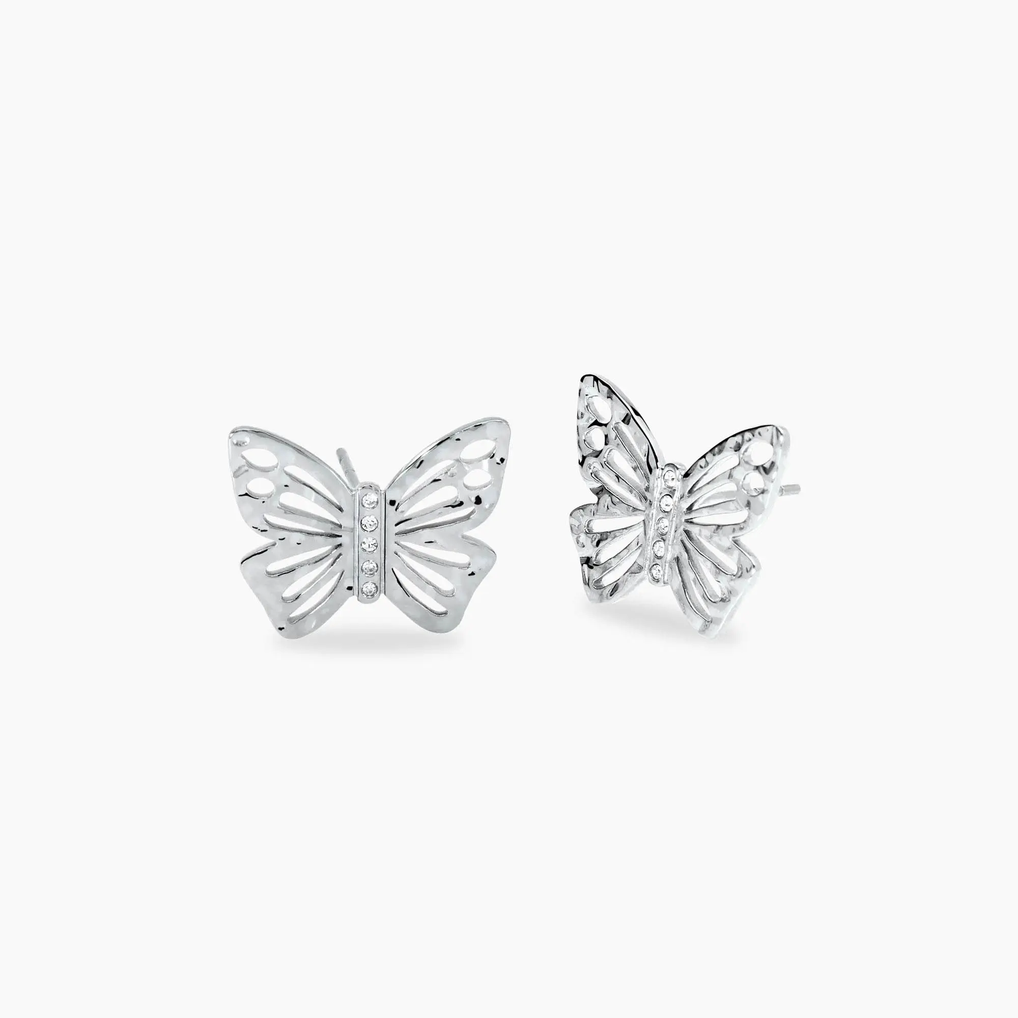 Orecchini a lobo con farfalla in acciaio martellato e cristalli bianchi.